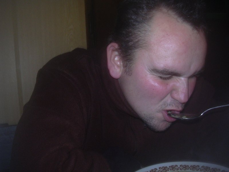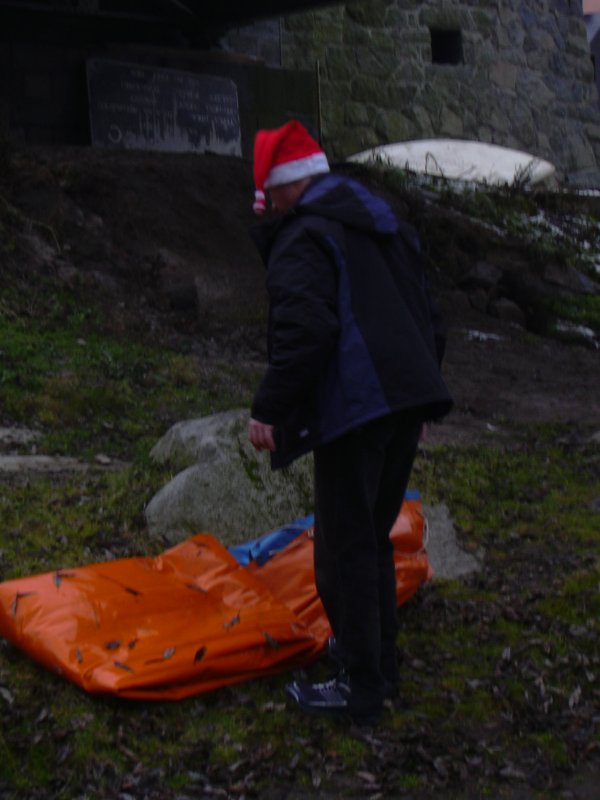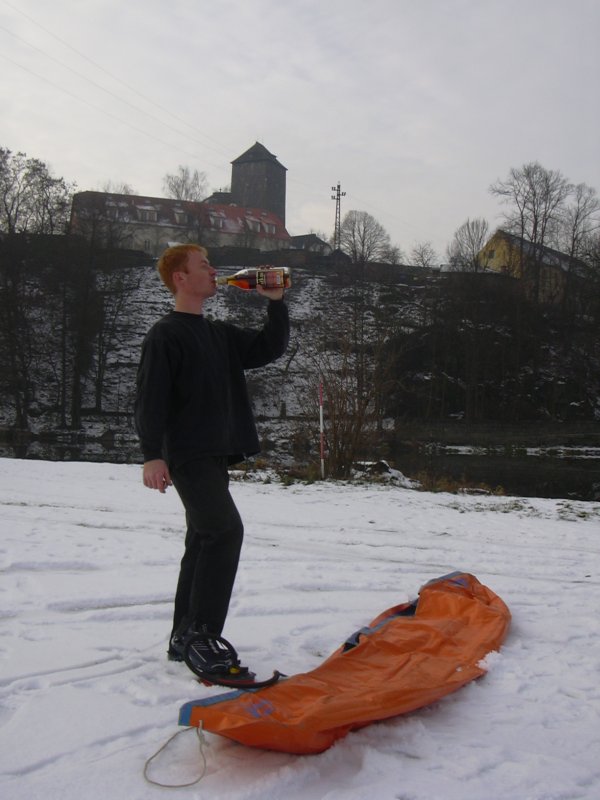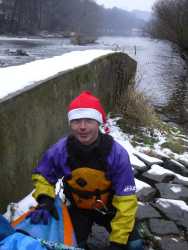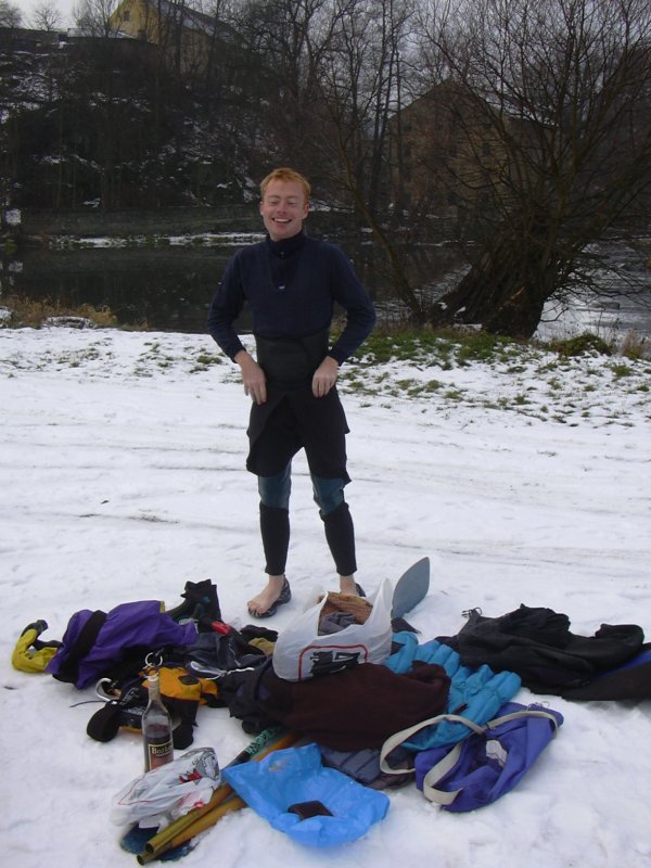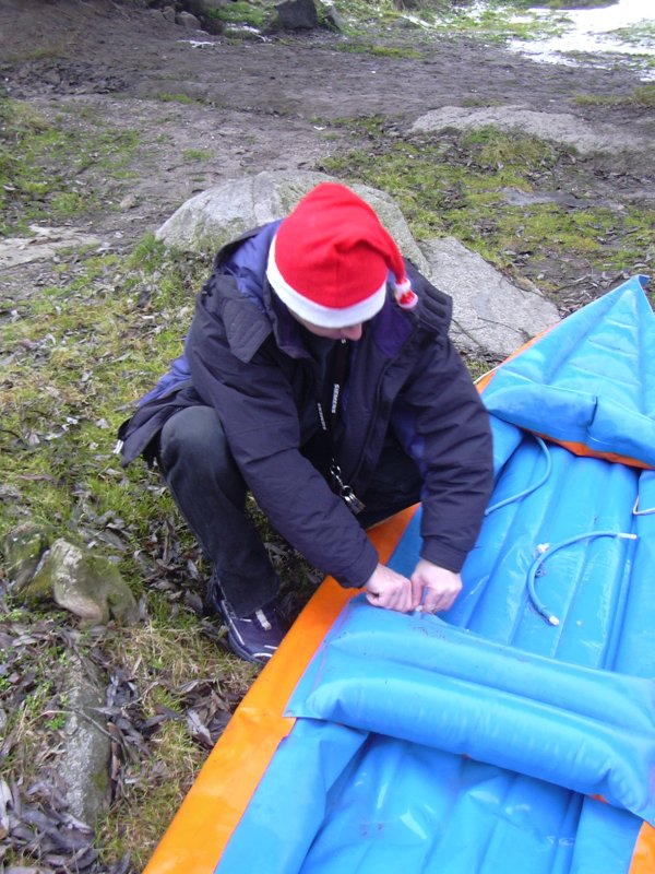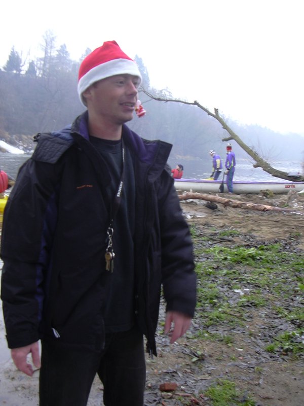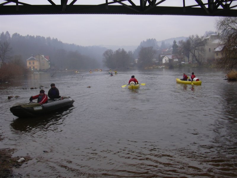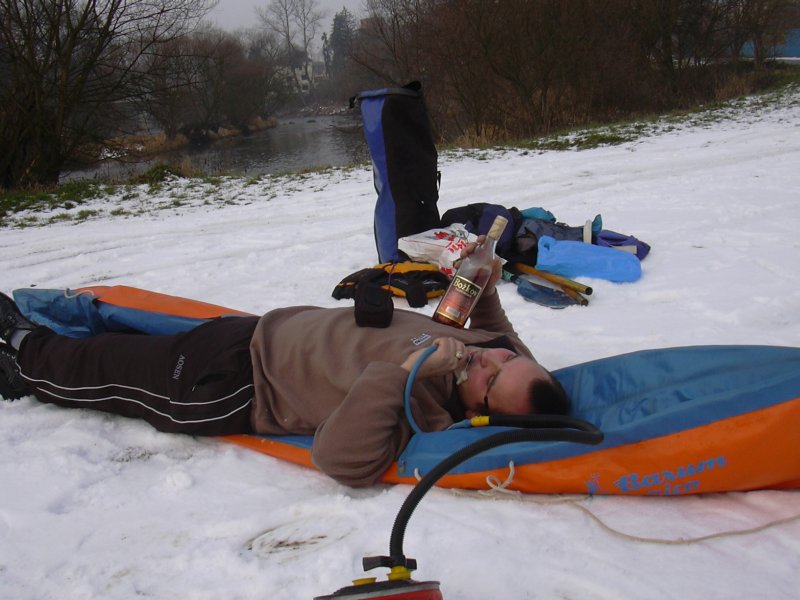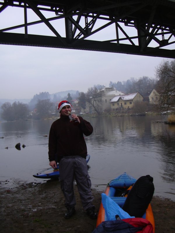 Brzo ráno, ještě za tmy vyhlížíme na zastávce autobus. Úspěšně se dostáváme jak do Prahy, tak i do Týnce nad Sázavou. Je zima, na tábořišti se povaluje slabší vrstva sněhu. Při nafukování plavidla desinfikujeme ústní dutinu rumem. Kolem nás prochází urostlý kanoista a ptá se kdo z nás dvou na tom nafukovači pojede. Odpovídáme že oba. Nevěřícně kroutí hlavou a odchází. Vytahuju neoprénový oděv, Ricco šusťačku a zapůjčenou polystyrenovou záchranku. Zato má dvoje plavecké brýle, takže se o něj nebojím. Oba nasazujeme santaklauzovské čepice s blikající bambulou a snažíme se vyplout. To by se nám i podařilo, kdyby Ricco v zadu nesedl na přívodní hadičky, kterými se nafukuje loď. Manévr nevydržel jeden šlaušek a povolil se uzávěr. Tím nám začal mizet vzduch z důležitého bočního válce. Ve stále se zvětšujícím náklonu jsme dojeli skoro až ke břehu. Kamarád si ale namočil tenisky. Oprava kajaku opětovným nafouknutím se podařila, stejně tak i druhý pokus o vyplutí.
