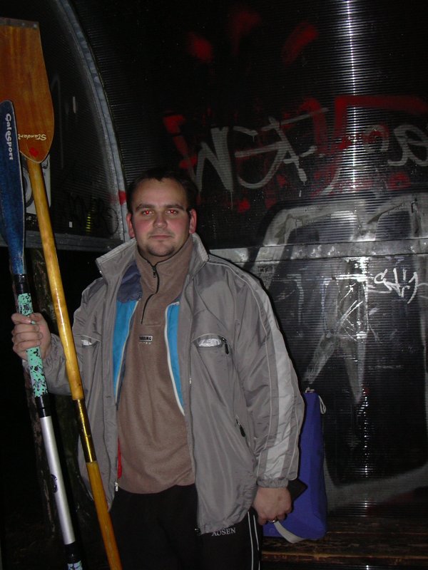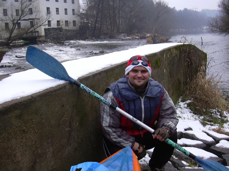 Někde, ještě na začátku nevydrželo Riccovi pádlo se znakem Artist a nápisem Standart. Zbytek cesty používal jen jeden list na způsob jízdy na kanoi. Cestou si nás, nevím proč fotili lidi. Obavy jsem začal mít z nadržené vody nad jezy. Tady jsme se většinou prodírali slabou vrstvou ledu. Nafukovací letitý kajak a lámající se led nejdou moc dohromady. Naštěstí loď vydržela. Na jednom jezu kamarád zafičel do vody po pás. Ještě že máme rum. Před Kamenným Přívozem jsme potkali vodáky s plastovou kánoí co měla díru ve špičce. Nechápal jsem, jak se jim to mohlo podařit. Je zima, morálka jde dolů spolu s hladinou lihoviny v lahvi. Domlouváme se na předčasném ukončení plavby a kotvíme v K. Přívoze. Balíme loď, vybavení a oblékáme civil. Ricco dopíjí rum. Jdeme se ohřát do hospody. Volám známé, která by mohla být toho času někde poblíž. Setkáváme se, plkáme. Snažím se z ní vymámit kdy jede něco do Prahy. Po nějaké době nasedáme do autobusu. Čeká nás ještě večerní cesta na Mělník. Pro kajak a Ricca přijíždí na zastávku jeho bratránek. Loučíme se.