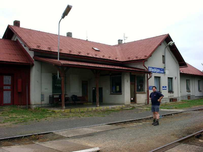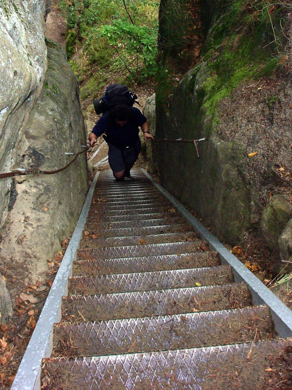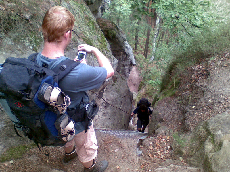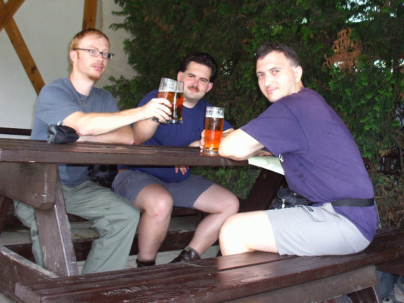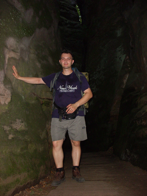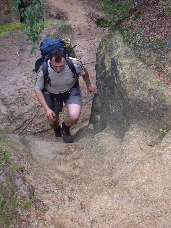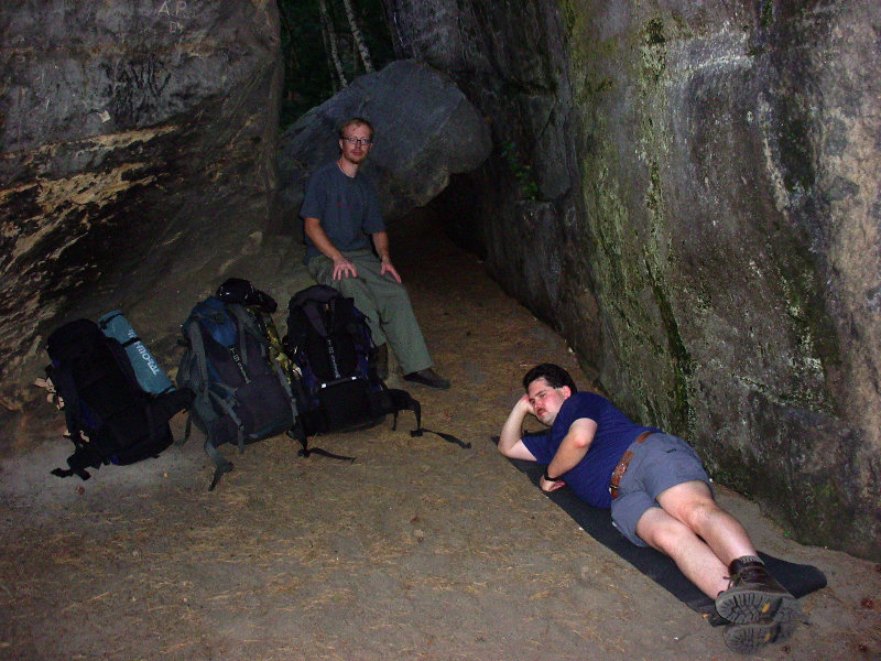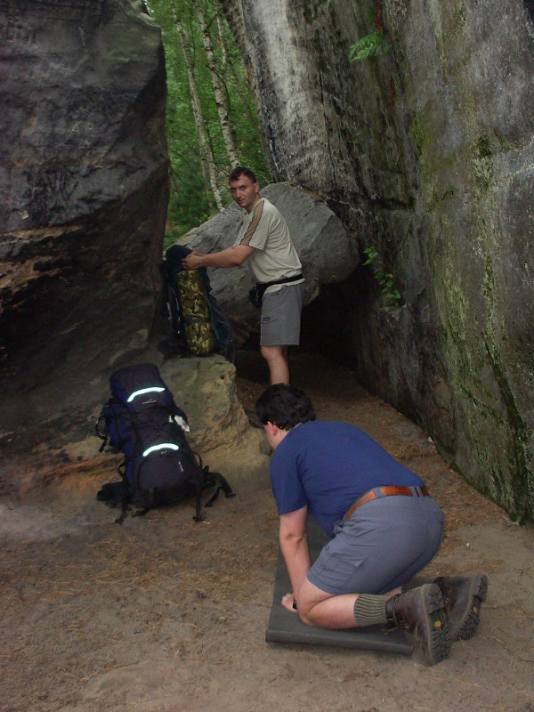 Po čtvrtečním grilování u kolegy jsem jel vlakem z Prahy ještě s kocovinou. Kluci se už ve vlaku posilňovali různými alkoholy a já s díky odmítal. Vlak nás dopravil do Bakova nad Jizerou, kde jsme přestupovali. Vlak nám jel až za hodnou chvíli, a tak přišla na řadu nádražní hospoda, kterou s Ujem známe už z našeho předchozího vandru. Pořád mě trápil bolehlav ze včerejší akce, takže ani pivo jsem si nedal. Po vystoupení z vagónu v Březině nad Jizerou nastalo klasické hledání restauračního zařízení. To se podařilo a jako bonus s pěknou servírkou. Dokonce nás bez reptání společně vyfotila. Bříška jsme potěšili něčím malým k jídlu, trochou pivka (já limčou), následovalo utažení tkaniček a naše kroky zamířily směrem k Drábským světničkám. Cestou po žluté turistické nás za chvíli vítala vesnice Olšina a v ní zahradní restaurace. Tady konečně můj žaludek neprotestoval co se týká pivka. Nezdrželi jsme ale se dlouho a následoval odhodlaný výstup do skal a hledání noclehu. Do světniček jsme vstoupili blízko Studeného průchodu a opravdu je v něm zima jako v pr... ledního medvěda. Při hledání placu na spaní to nakonec odnesl jeden převis dostatečně daleko od cesty. V noci spadlo pár kapek, ale jinak bez problémů.