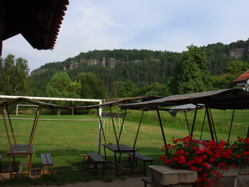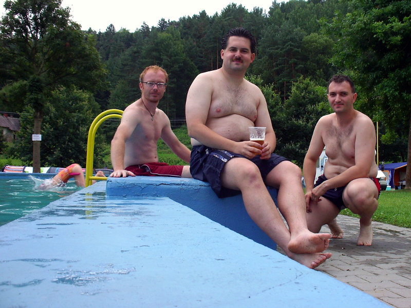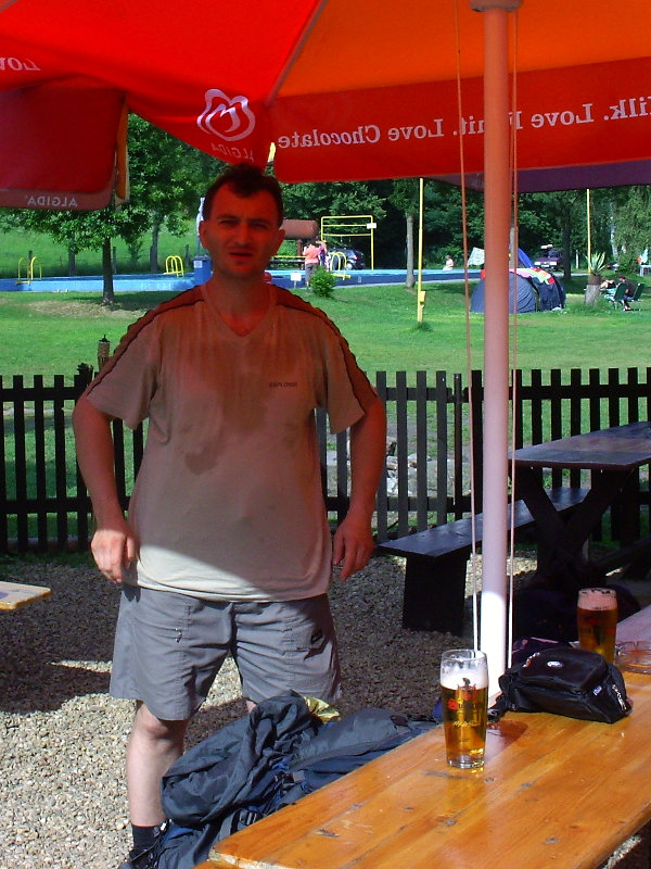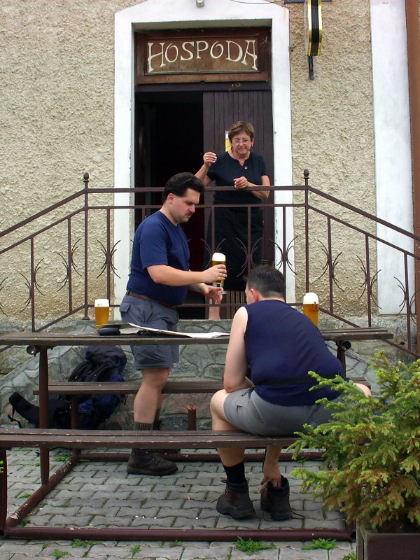 Ráno po snídani a zabalení věcí jsme pokračovali kolem pseudokrasové trhlinové propasti na Krásnou vyhlídku, bohužel tou dobou se zavřenou restaurací. Výhled byl taky nic moc a proto s vrchem Mužský po pravé straně naše pohorky dusaly z kopce do Příhraz. To místo si pamatuju ještě z dob, kdy jako malé robě jsme tam strávili dovolenou. To bylo ještě za komunistů. Hotel, kde jsme tenkrát bydleli je už nějakou dobu zavřený, z přírodního bazénu, co patřil k hotelu jsou ruiny. Kousek vedle ale bylo otevřené občerstvení, hurá. Trocha povzbuzovadel a šlo se dál. Počasí nám nepřeje, obloha je zatažená jako záclony hambince. Vypadá to, jakoby mělo každou chvíli začít pršet. Odtud cesta vedla většinou po asfaltu, takže naše nohy v pohorkách dostávaly zabrat. Zastávka v hospodě v Žehrově. Ve Skokovech jsme navštívili Michalova strýce, následovala kávička, zákusek, ani se nám od něj nechtělo :-) Ale nedalo si nic dělat, plán byl jasný, dojít do Kacanovy k jakémusi Vlkovi, a tam se vetřít na jeho oslavu. Cestou se udělalo hezky. Ujo z mapy zjistil, že v Kacanovech je koupaliště. Tomu nešlo odolat. Po celodenním tahání báglu na zádech to bylo labůžo. Voda sice studenější, ale i tak se mi z ní moc nechtělo. Jak už to tak bývá, u bazénu se nacházelo i občerstvení. Jakmile jsme si sedli se zaslouženým pivkem pod slunečník, strhla se vydatná přeprška. Naštěstí neměla dlouhého trvání. Horší bylo Michalovo reptání na bolavý zub. Nakonec to dopadlo tak, že si vzal taxika do Turnova a odtud se vydal vlakem do Prahy na zubní pohotovost.