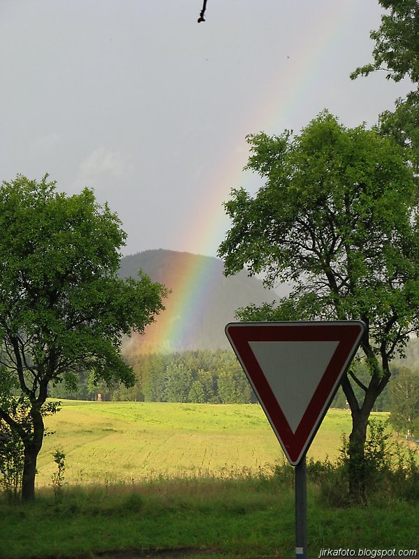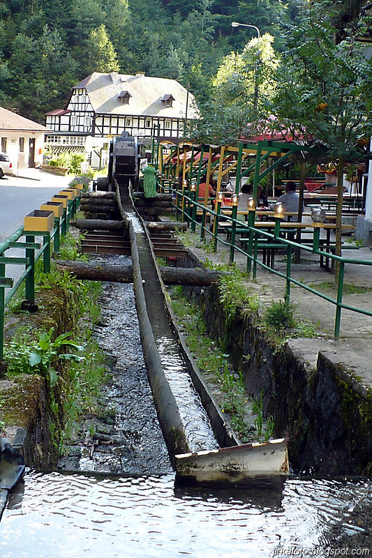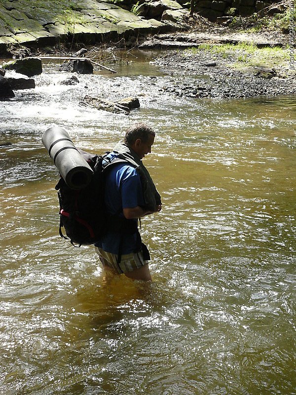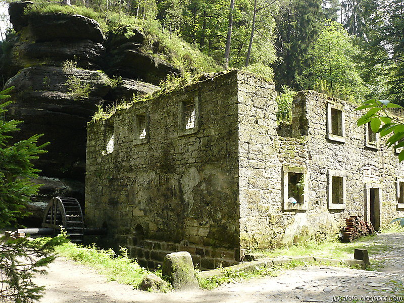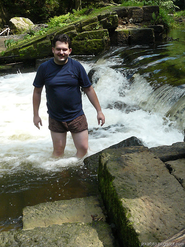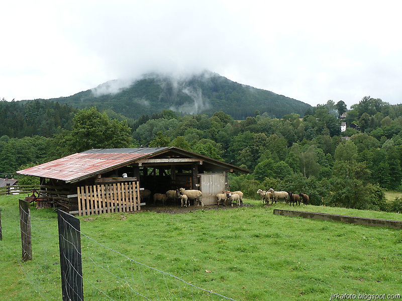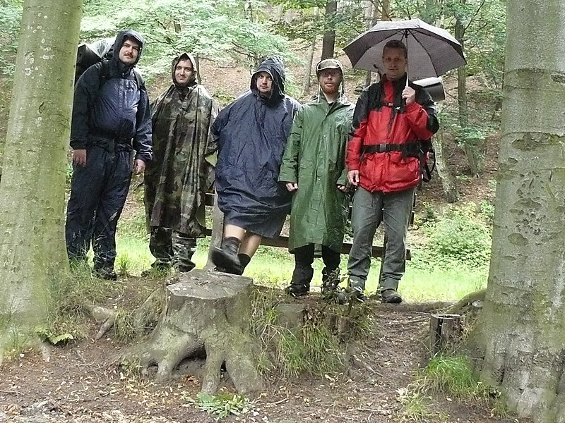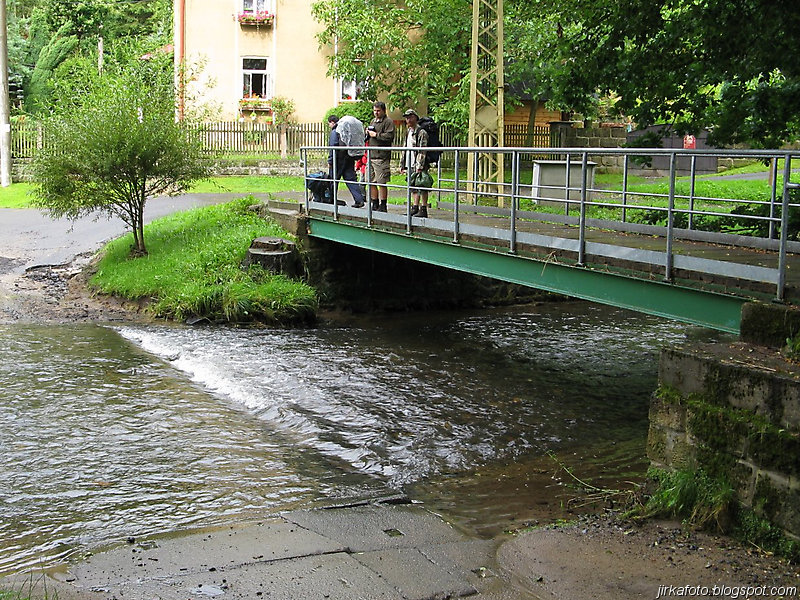 Ráno krátce po probuzení začalo poprchávat. Celí nevrlí jsme si zabalili věci a na chvíli se ukryli v nedalekém altánu. Po krátké poradě bylo rozhodnuto, pokračuje se dál. Načež byly z báglů vyvrhnuty pláštěnky a ponča, jen Pavel nám vytřel zrak s deštníkem a šlo se po modré. Jít ostrým krokem v pláštěnce a většinou do kopce se vopruz. Člověk začíná mít pocit, že by bylo snad lepší zmoknout, než se pařit v tom igelitu. V lese bylo plno hub. Jedna byla přímo na cestě, nejspíš vypadla nepozornému houbaři. Stále poprchávalo, až po necelých dvou hodinách přestalo. Zakrátko nás uvítala říčka Kamenice. Ještě tady byly patrné stopy po nedávné povodni. Hledali jsme nějakou hospodu kvůli jídlu. Naše úsilí bylo odměněno, hospůdka i se zahrádkou, slunečníky, prostě paráda. Venku se nám líbilo, ale paní hostinská nebyla ochotná chodit ven, což by nevadilo, ale déšť, který se opět přihlásil o slovo nás přesvědčil ke vstupu do hostince. Většina z nás si dala jako první chod polévku, především česnečku a ta byla opravdu vydatná. Potom následoval hlavní chod a zase velká porce. Můj žaludek měl co dělat aby všechny ovocné knedlíky, co byly na talíři do sebe nasoukal. Vůbec se nám odtud nechtělo. Slunce bylo ale jiného názoru a přece jen nás z hospůdky vytáhlo zpátky na cestu. Akorát co jsme přešli most a zašli do lesa, se znovu rozpršelo. Shodli jsme se na tom, že pláštěnky si už odmítáme obléct, zvlášť když nás čeká výstup, tak byla na programu nucená pauza pod převisem. Alespoň nám vytráví. Jen co přestalo pršet, šlo se dál stále po modré až k Dolskému mlýnu. To už se začalo slunce nesměle ukazovat a to rozhodlo o krátké pauze, během níž nás s Honzou zlákalo koupání pod jezem u mlýna. Sotva jsme vylezli z vody, vypadalo to zase na déšť. Po krátké poradě co dál bylo naším cílem dojít do Vysoké Lípy, což znamenalo vyfunět strmou cestu nahoru.