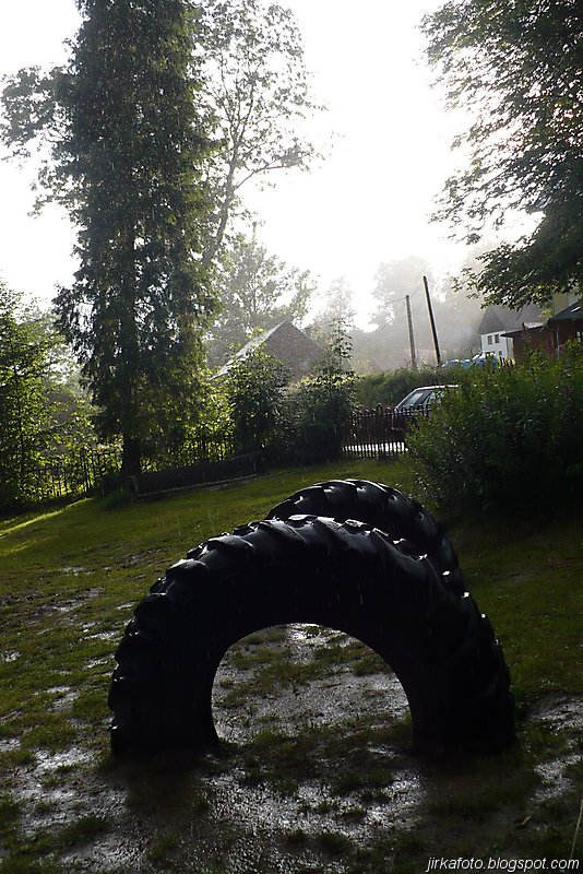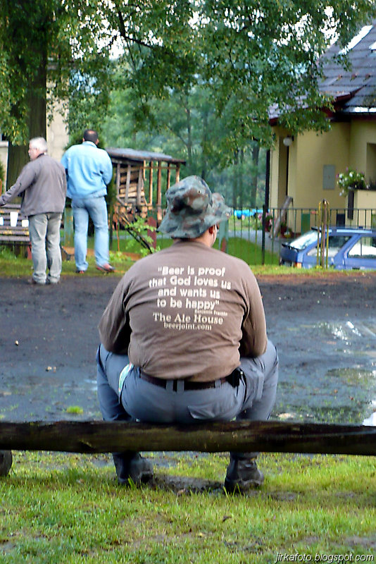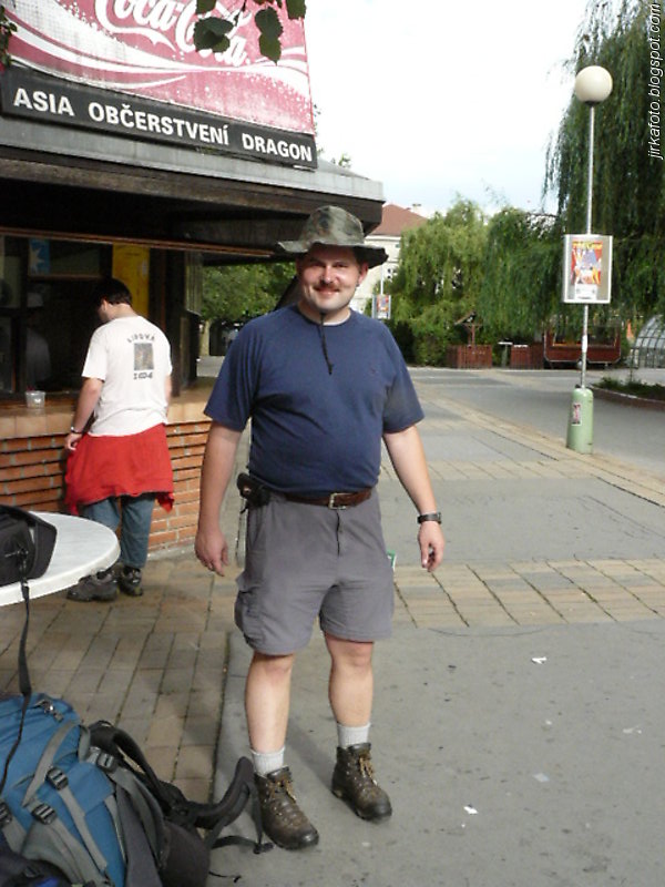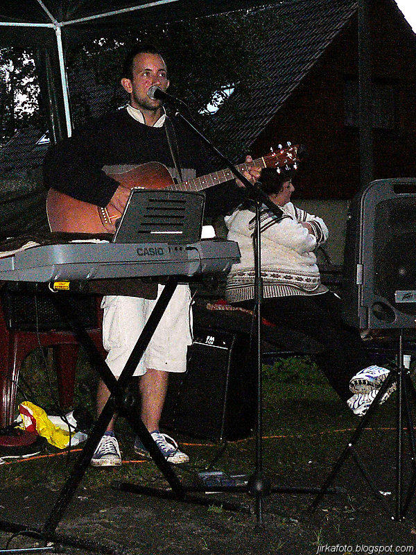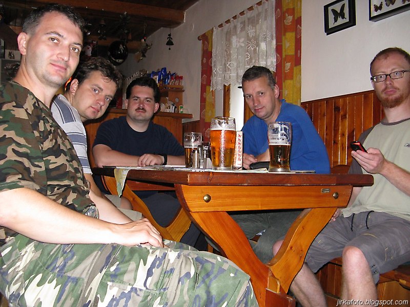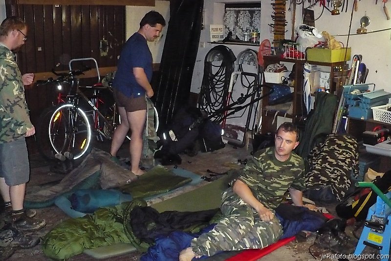 Ještě před západem slunce jsme se nebyli schopní domluvit na noclehu. Ze slavnosti se nám nechtělo, obzvlášť, když venku každou chvíli pršelo. Kdosi navrhoval přespat pod střechou na lavicích u kiosku. Taky se přetřásala možnost postavit stan na louce naproti hřišti. Když se začínal snášet soumrak, nedalo mi to a promluvili jsme si s místním opékačem masa o možnostech přenocování. Byly mu předneseny naše návrhy, které šmahem odmítnul. Doporučil nám nějaké převisy s poznámkou, že pokud nevíme kde je hledat, tak nemáme šanci. Při pokecu vyšlo najevo, že pán je celník, stejně jako Michal. Po chvilce nám nabídnul přespání u nich doma, což jsme s díky odmítli, ale nakonec se nechali ukecat, přece jen téměř celodenní déšť udělá bačkory i z tvrdých trempířů :-).