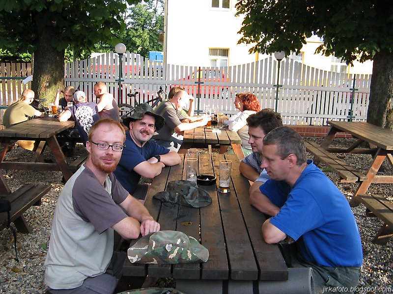 Hned za nádražím nás uvítala hospoda a v ní Pavel. Po seznámení s ostatními při pivku a už kompletní jsme vyrazili přes městečko. Zastavila nás restaurace na druhém konci města. Pivko i večeře byly výborné a odcházeli jsme až za šera. První nocleh byl kousek za městem u lesa a jakési mini trailové dráhy.