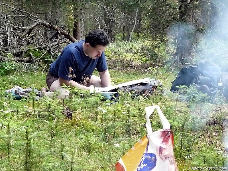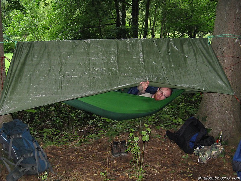 Po zabydlení Mandy trval na rozdělání ohně. Nebylo v našich silách mu to vymluvit. Po krátké chvíli od vzplanutí prvních jazyků ohně se po cestě, od které bylo naše tábořiště vzdáleno několik desítek metrů, objevila Lada Niva. Oheň byl zadušen a po odjetí vozidla znovu vzkříšen. Byly opečeny uzeniny a ty spláchnuty přineseným pivkem. Podařilo se mi ještě vypadnout z hamaky a to ještě před požitím alkoholu, jinak se nic divného nestalo. Byli jsme celkem unavení, v nohách bylo celkem dost kilometrů a proto šli celkem brzo na kutě.