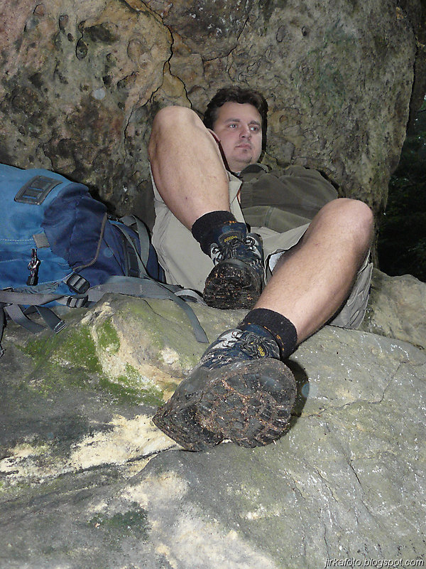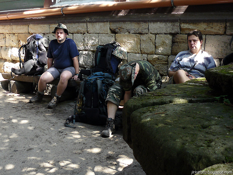 Několik posledních kilometrů se šlo po silnici, což já osobně nemám rád, ale nic se nedalo dělat. Kus za cedulí byla objevena útulná hospůdka s rozumnými cenami a té jsme podlehli. Pojedlo se, popilo se a byla pohoda. Po poradě bylo rozhodnuto utábořit se ve skalách nad Hřenskem směrem po žluté, někde u bunkrů. Chlapci sháněli po celém Hřensku vychlazené pivo v plechu, což se jim nakonec podařilo. Cesta nahoru do skal byla obtížnější než jsme si původně mysleli, ale dalo se to. Zhruba po dvou kilometrech se objevil první bunkr a kus za ním Mandys objevil v lese, kousek od cesty malou lesní mýtinu.