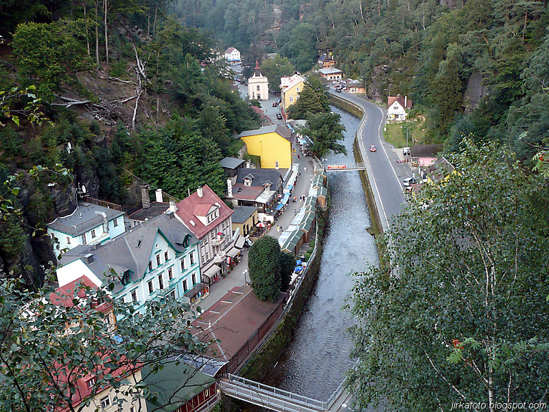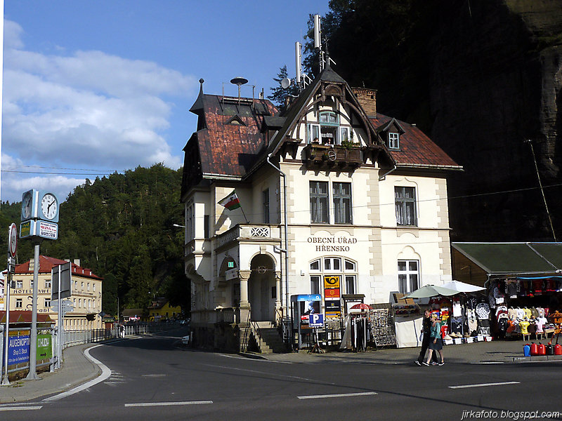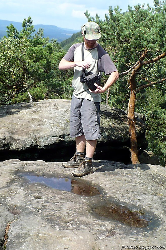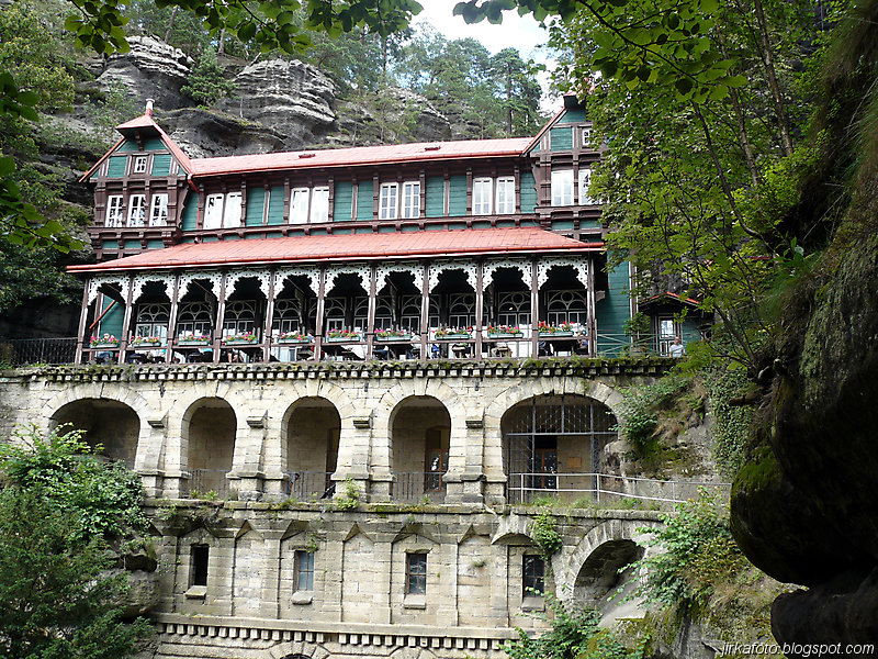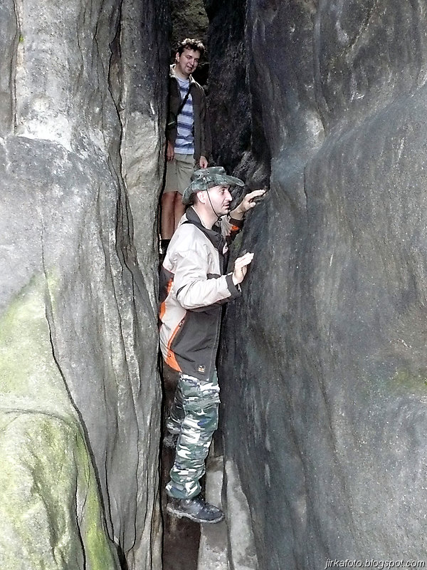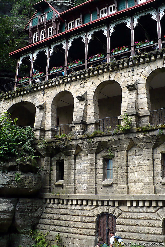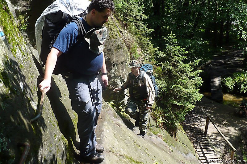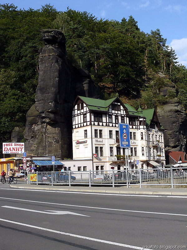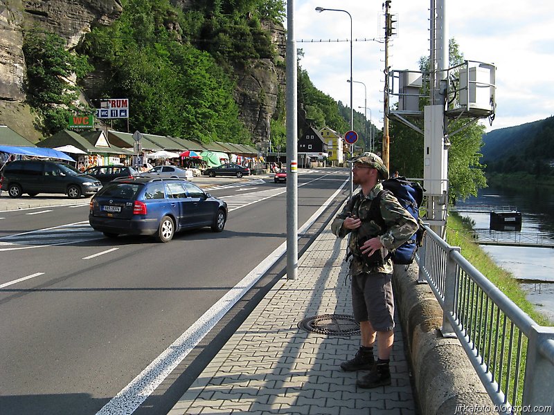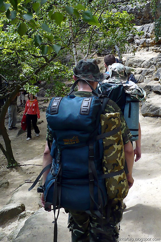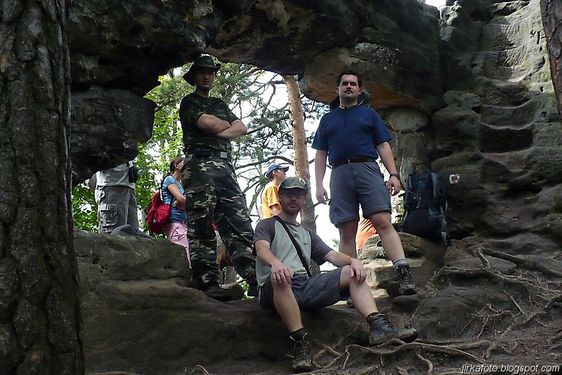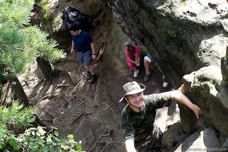 Už pod bránou nás uvítaly mraky nejrůznějších turistů. od mimin, přes děcka, zamilované páry až po důchodce u kterých nebyla jistota že se dovlečou až nahoru. Lidem se úspěšně dařilo lézt ostatním účastníkům do záběrů fotoaparátů a kamer, do toho se mísilo halekání dospělých, okřikující a hledající potomky a sebe navzájem v několika jazycích. Václavák hadr. Nicméně jsme se prodrali až nahoru k restauraci s úmyslem se občerstvit. Jaké bylo naše překvapení, když hospoda byla až za turniketem, kde se vybíralo vlezné na Právčickou bránu, což obnášelo sedmdesát káčé na hlavu! Michal se rozčiloval (nutno říct že marně), protože stánek s turistickými informacemi byl taky za závorou a on chtěl, nešťastník jen razítko do jakéhosi zápisníku. Po krátkém odpočinku putování pokračovalo dál do Hřenska.