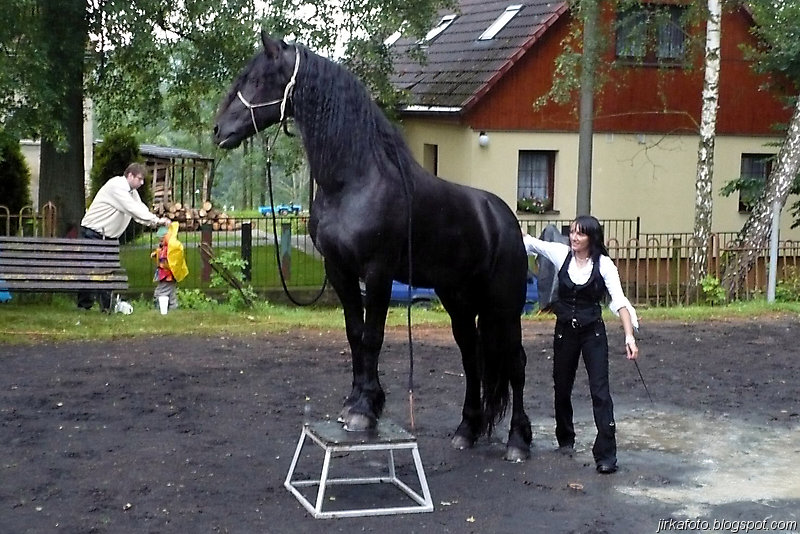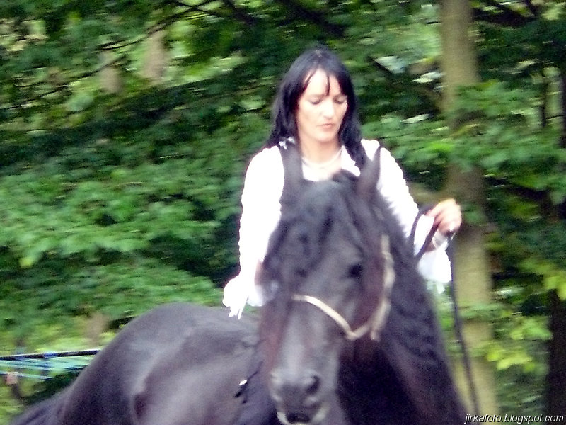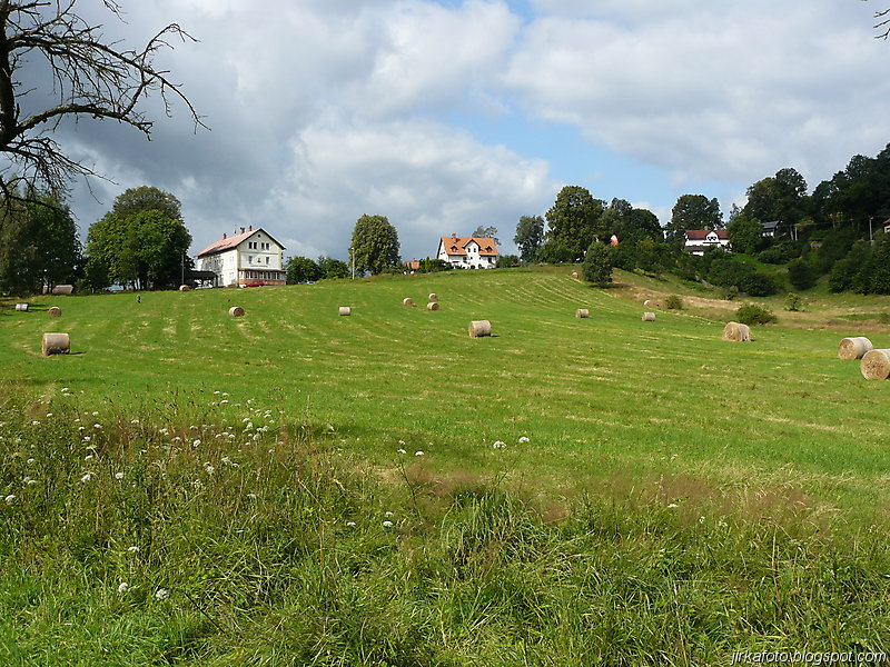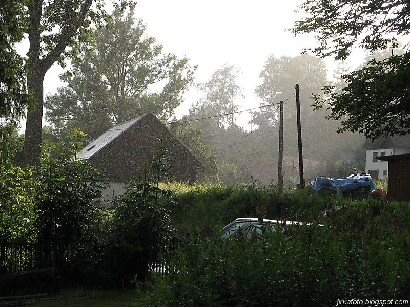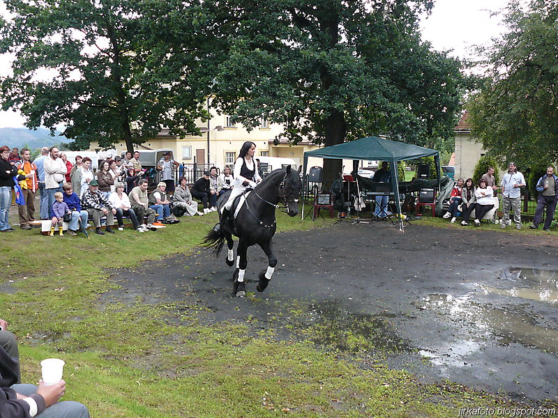 Ve vesnici byl objeven kiosek s venkovním posezením a co bylo důležité, byl zastřešený. Jediná vada na kráse spočívala v nevrlé obsluze zmíněného kiosku. Ještě před tím proběhla rozlučka s Pavlem, který spěchal na bus do Děčína na fotbal. Tím jsme zbyli čtyři.Během konzumace a porady kudy dál se do mě dala zima. Možná to bylo větrným počasím, spravila to až mikyna s bundou. Během občerstvování jsme zaslechli, o chystané oslavě svaté Anny, která se má uskutečnit na místím hřišti, což bylo co by kamenem dohodil od místa našeho přechodného útočiště. To se také vyplnilo. Zvědavost nám nedala a po chvilce jsme se přesunuli na zmíněné hřiště. Po zaplacení vlezného, tuším že padesáti kaček nám byla umožněna konzumace pečínky a nákup točeného pivka za symbolický peníz. Nálada byla výborná jen do doby než znovu začalo pršet a to pořádně. Od té doby to byl vytrvalý déšť, přerušovaný občasnými přestávkami až do noci. Vesničané měli přichystaná dvě hudební pódia, kde se střídali v jednom případě začínající, v druhém nejspíš končící místní hudební celebrity. A to nebylo všechno, viděli jsme podle mého názoru hodně dobré vystoupení cvičeného koníka a nakonec vystoupení hudebníka Pavla Petrana.