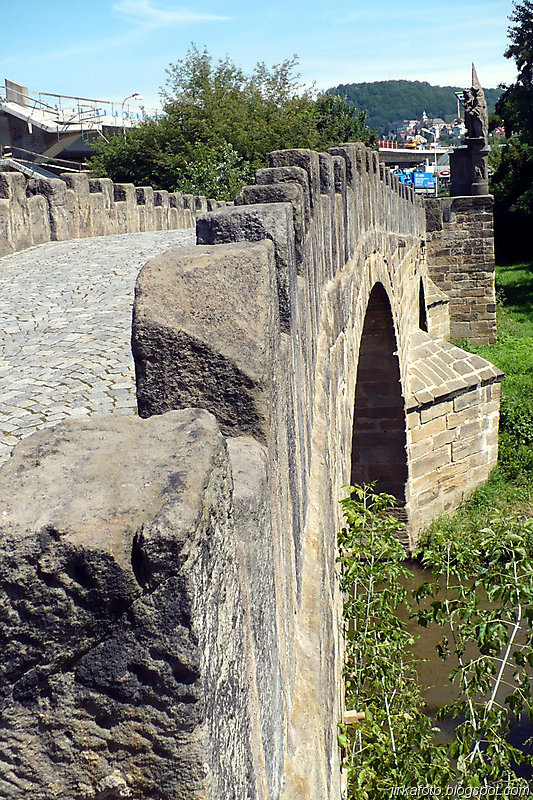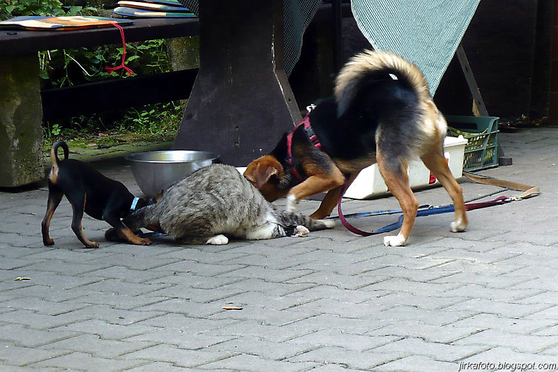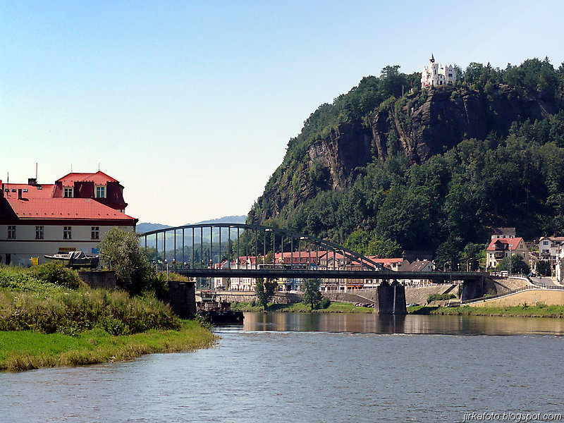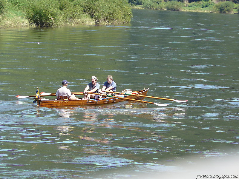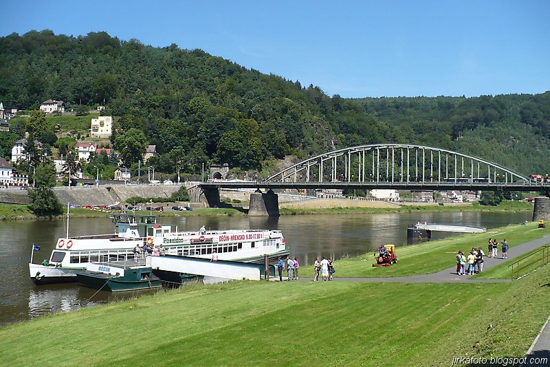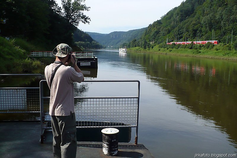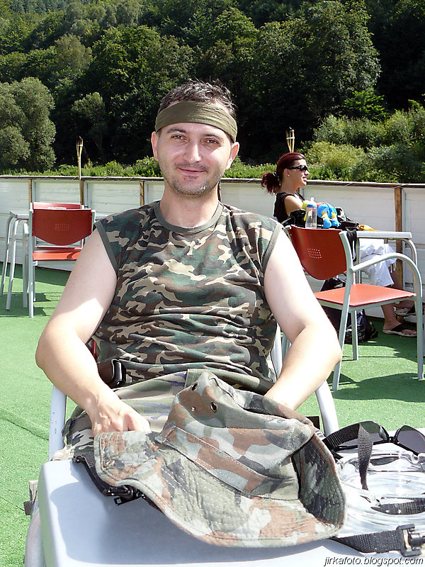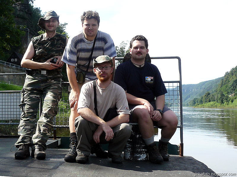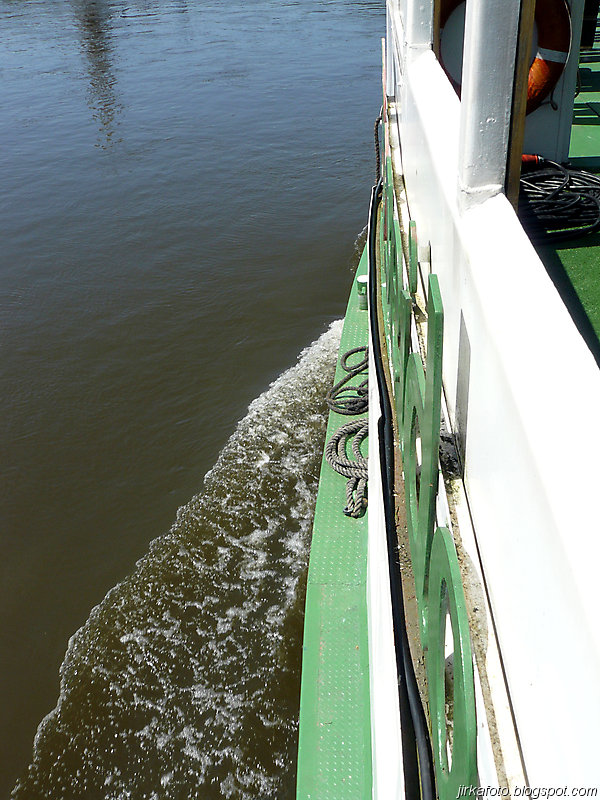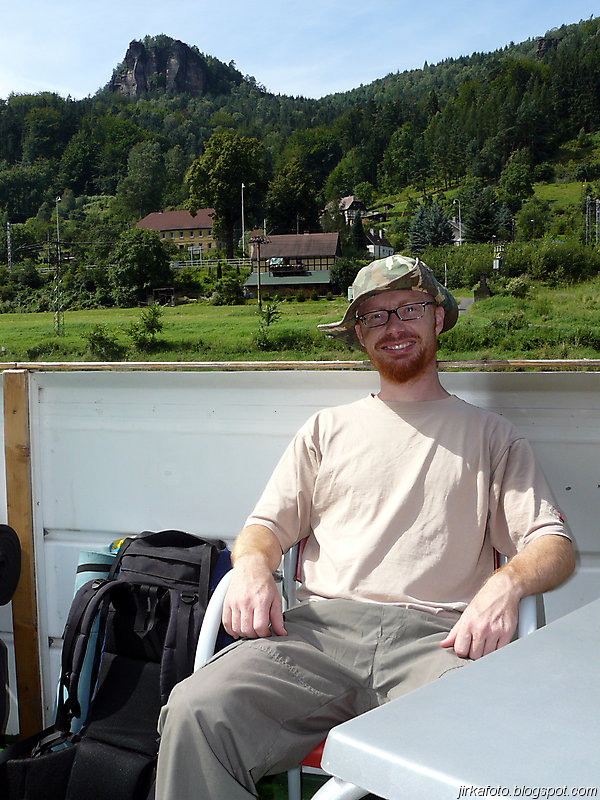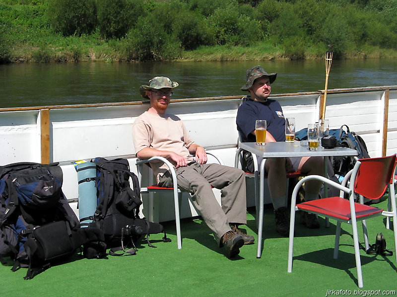 Slunce svítí, jasno, vedro. Probuzení bylo akorát, abychom se stihli nasnídat a sbalit věci. Na dnešek byl naplánován přesun do Děčína parníkem! Parník měl zpoždění, což nám nevadilo, ale nemuseli jsme tolik hnát cestou zpátky do Hřenska. Uvítala nás na palubě docela pohledná, ale jak jsme záhy zjistili značně neochotná servírka (nebo bych měl napsat stevardka?) Parníkem nejelo moc lidí a tak byl zabrán stolek vzadu na palubě. Dali jsme pivko, což bylo za chvíli dopito a poohlíželi se po obsluze. Dole u baru nikdo nebyl. Mému krátkozraku neunikla servírka v kapitánově kajutě. Řekl jsem si, "nebudu prudit, chvíli počkáme, vždyť vo co jde". Minuty ubíhaly a žízeň rostla. Nakonec jsem se odhodlal a šel se vetřít do kajuty. Servírka se slovy "vy si mě najdete všude" se jala nás obsloužit. Přinesla nám pivko, ale jaké nemilé bylo překvapení, když jedno pivo bylo úžasně kalné. Nechápu, jak se jí to mohlo podařit. Na reklamaci jsem neměl morál.