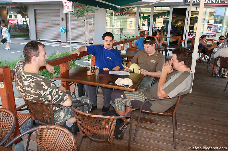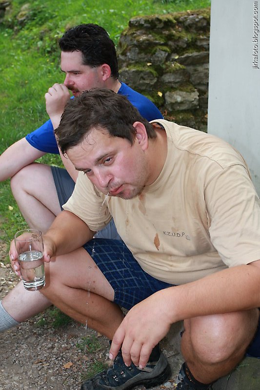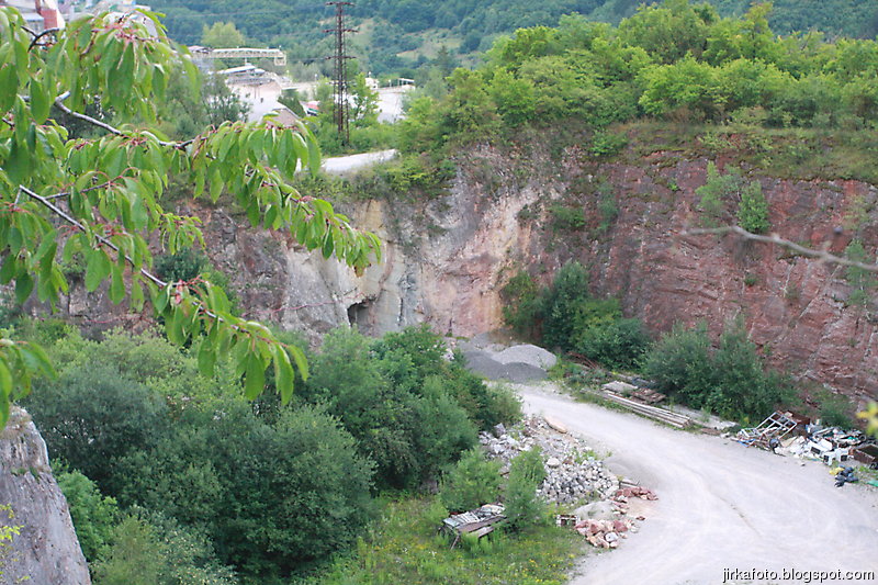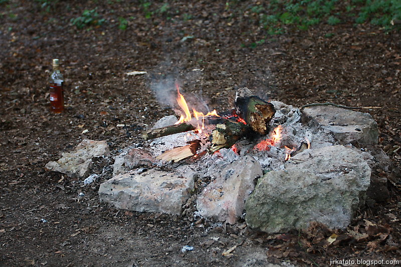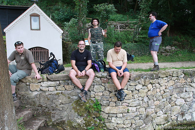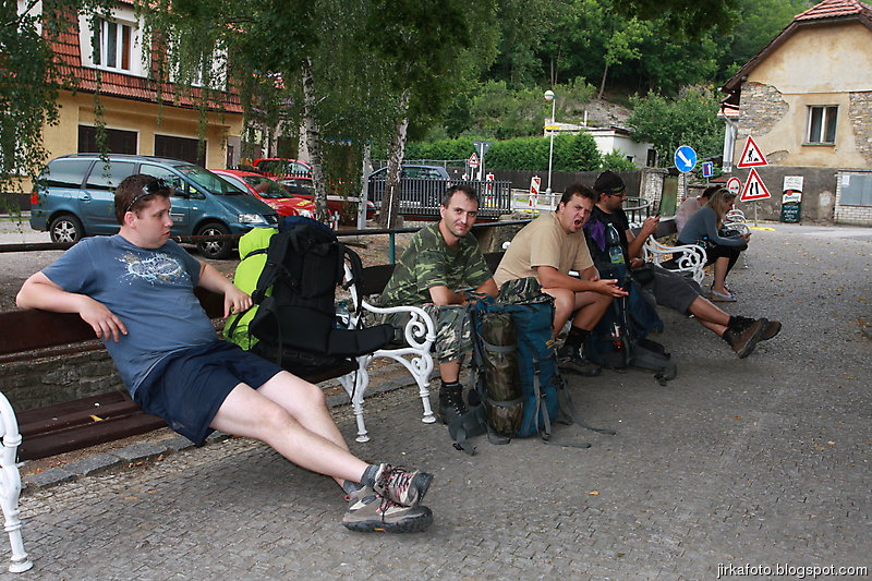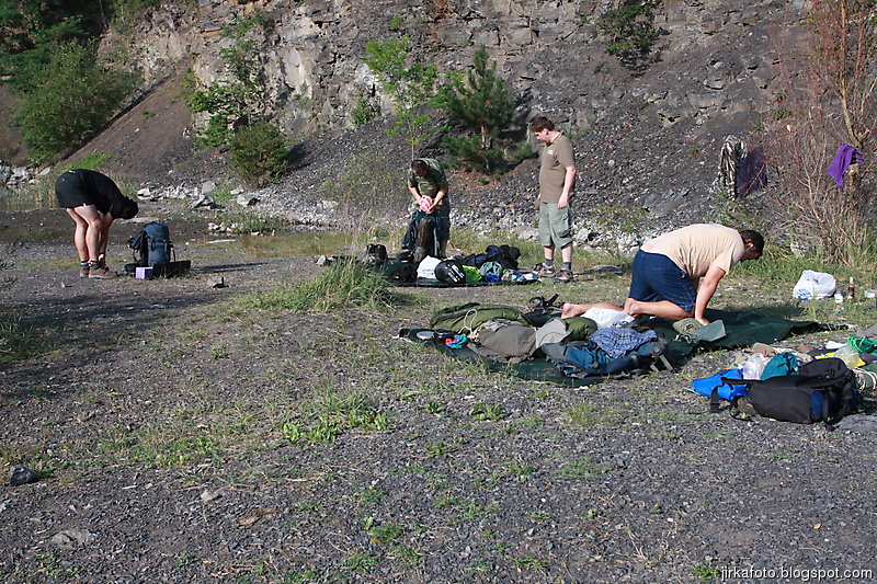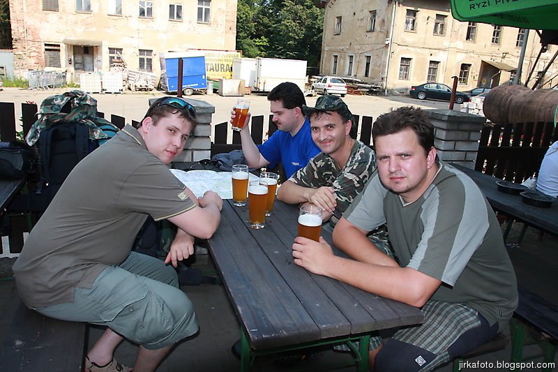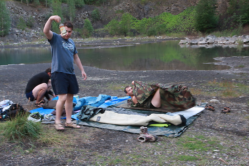 Tentokrát jsme si nenechali ujít jakýsi rodinný pivovar Medvěd, kousek za nádražím. Cesta kolem kolejí, pod mostem a za ním nás uvítaly neopravené staré budovy. Vypadalo to jako nějaké gheto, ale nezalekli jsme se a vstoupili do stejně neutěšeného dvora, kde světe div se, v snad jediné opravené budově byla hospoda. Tady nás po nějaké době našel poslední kamarád Jirka. Nezaváhali jsme a ochutnali místní pivo názvu "Zlatý kůň". Zezačátku chutnalo nic, moc a s přibývajícími doušky bylo lepší a lepší. Jídlo taky ušlo a míra rozsezení se stávala neůnosnou, zvlášť kdy nás čekal menší výšlap do kopce. Silou strašlivé vůle, která je nám vlastní, jsme se zvedli, nasadili bágly a cupitali přes most po zelené turistické do přírody.Vedo byl pořád velké. Kluci na mapě našli kousek od zelené nějaký lom, a proč ho tedy neprozkoumat. Cesta k němu byla snažší, než jsem myslel, zvlášť když proti nám chodili lidi s lehátky, karimatkami, dekami a jiným vybavení na válení se u vody. Lom byl ůžasný, neskutečně čistá voda nás okamžitě zákala ke koupeli a dokonce Mandys rozdělal ohýnek. Prostě romantika jako prase. Jenom jakýsi páreček asi neměl z našeho podvečerního příchodu radost. Ale co, borčus jsme moc nedělali :-)