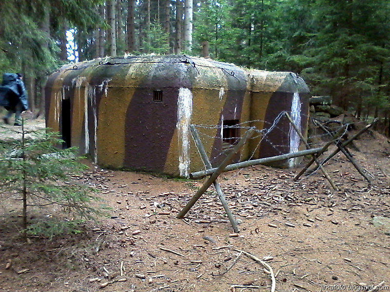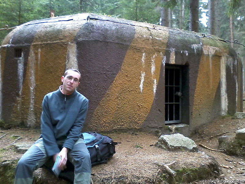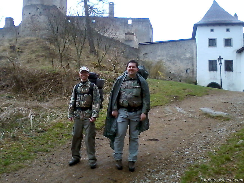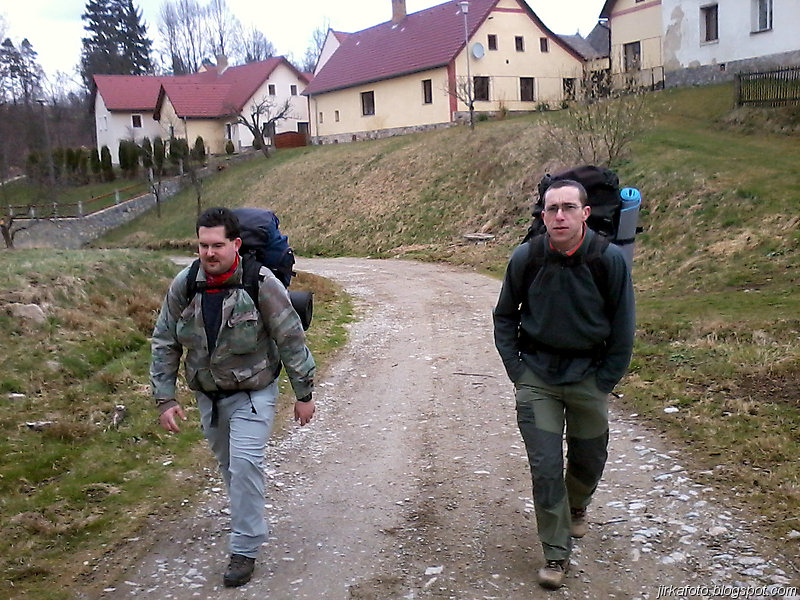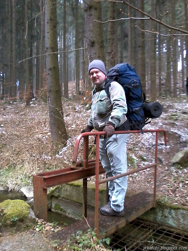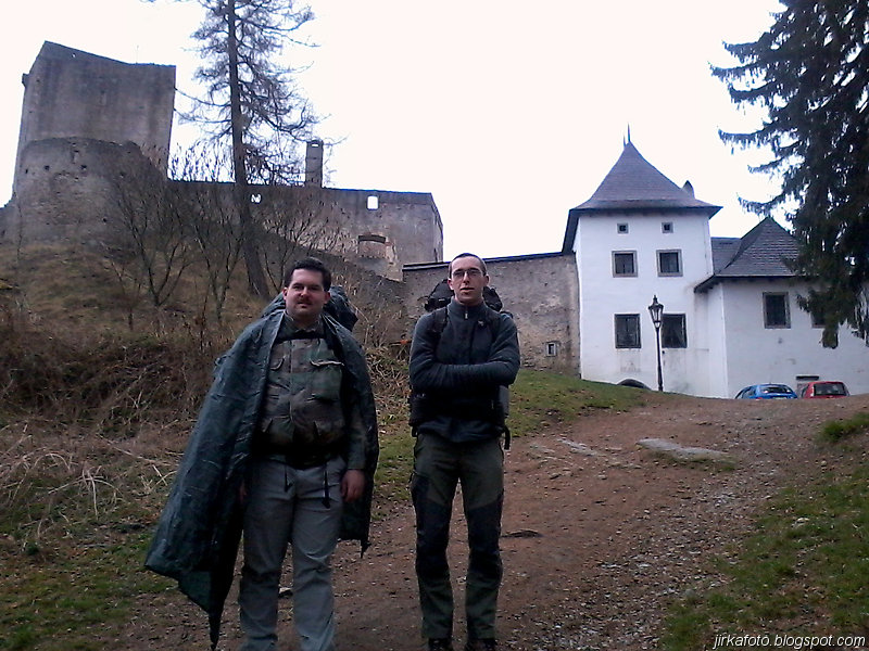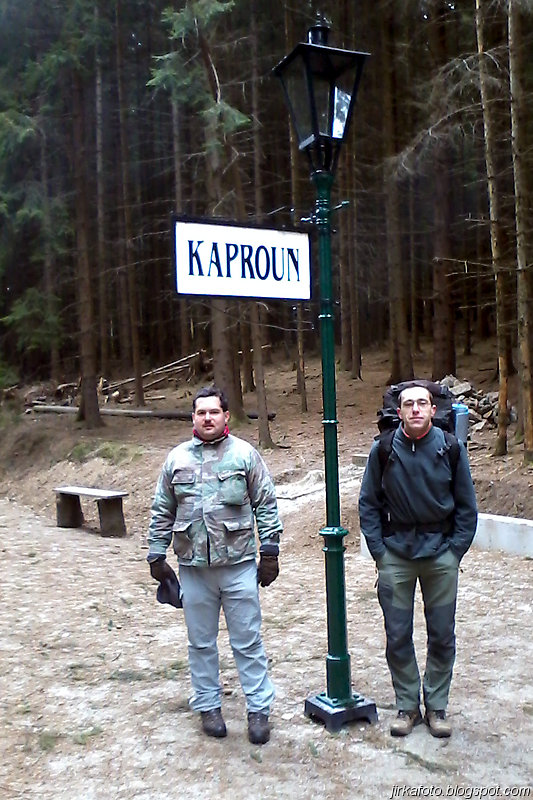 Od vlaku naše cesta vede přes Blato, kde je penzion u kostela zavřený, přes pás pohraničního opevnění. Tady je Jarda ve svém živlu. Za Jelením vrchem hledáme modrou turistickou a za chvíli na nás mezi stromy vykukuje Landštejn. Hrad byl sice zavřený, ale na Ujovo doporučení vplouváme do útulné a příjemně vyhřáté hospůdky. Pivko bodlo, ale k jídlu tu nic moc neměli. Po odpočinku zvedáme kotvy a přes Vitíněves naše pohorky dusají do obce Kaproun. Lehkou vadou na kráse se stala většinou asfaltová cesta, ze které mě začaly slušně bolet nohy. Ochlazuje se, začíná slušně pofukovat a dokonce o sobě dává vědět i nějaká ta menší sněhová přeháňka. Naštěstí byl v Kaprounu otevřený penzion U Paulánů. Inzerát na něj se dá najít třeba na jízdence z úzkokolejky. Jsme celkem vymrzlí a tak není nad čím koumat. Ceny jsou znatelně vyšší než v okolních obcích, řekl bych srovnatelné s Prahou. Nabídka jídel taky nic moc. Ale jak jsme ucaprtaní nebráníme se.