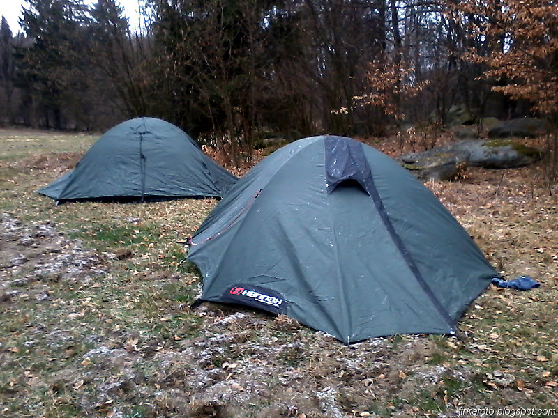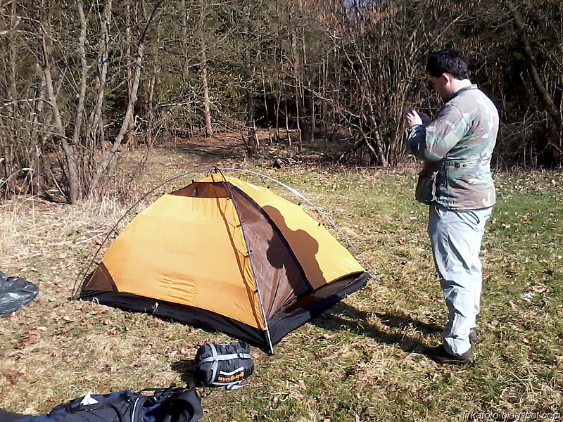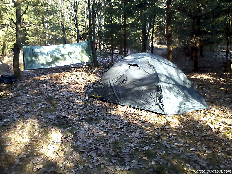 Asi jsem udělal dobře, protože v noci trochu zasněžilo, tedy spíš než vločky padaly takové malé krupky a ráno je na louce a stanech šedivák. Sice nám voda v lahvích nezmrzla, ale v noci byl určitě lehký mráz. Na zastávku to máme doslova co by kamenem dohodil a dokonce tam kempí partička asi šesti lidí a na ohni opékají buřty.