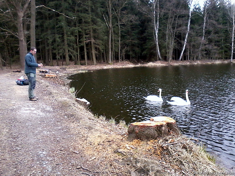 Vlakem se přesouváme dvě zastávky do Střížovic. Jde se zvesela, kolem Krvavého rybníka. U Studeného rybníka se Jarda rozhodl přecpávat labutě chlebem. U ratmírovského rybníka nám vpadnul do cesty jakýsi kemp s otevřenou restauraci. Pivko a klobása přišla našim kručícím žaludkům vhod a vhledem k tomu, že v hospodě netopí a neriskujeme nachlazení po chvíli přifičí na stůl i rumajzlík. Máme štěstí, při pobytu v restauračním zařízení se venku několikrát slušně rozchumelilo. Po vybouření sněhového živlu pokračujeme dále po červené kolem Hamerského potoka.