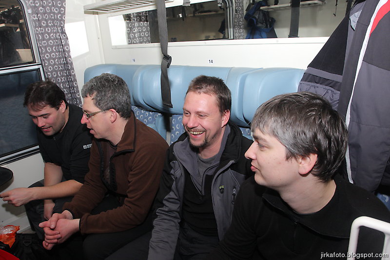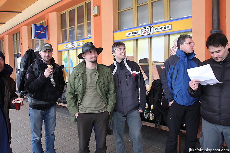 Cesta vlakem se líně vlekla, párkát jsem si zdřímnul ve snaze dohonit spánek z uplynulého týdne. Několikrát jsme přestupovali, už ani nevím kde, jen si vybavuju Zábřeh na Moravě. V čekárně tam totiž byl obchůdek s párky v rohlíku a já už měl hlad jako vlk. Kouďák smotnul první brko. Náš vlak nabíral zpoždění, na tabuli svítilo 30 minut. To byla ta správná chvíle promluvit si s paní na informacích jak to bude s naším dalším přestupem. Neradi bychom skončili někde v půli plánované cesty. Madam byla ochotná, zavolala na vádraží kdesi v horní dolní a ujistila nás, že lokálka na nás počká když je nás tolik.