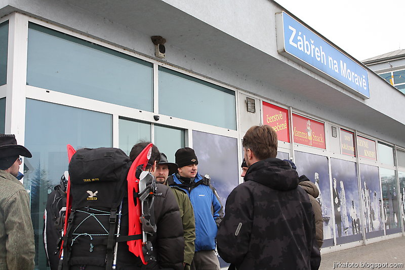Na Hlaváku jsem se ocitnul docela brzo, nebylo ani osm. Protože z lidí, co jeli na vandr jsem znal jedině Mandyse, stoupnul jsem si k pokladnách, kde byl sraz. Tam se po chvíli objevilo několik lidí se sněžnicema. Dal jsem řeč, ale na dotaz ohledně Švestkové se na mě chlapci nechápavě podívali a začali kroutit hlavama. Nakonec mi prozradili, že ještě nejací týpci se sněžnicema jsou ve vestibulu. To se ukázalo jako ta správná informace. Seznámil jsem se s prvními objevivšími členy naší expedice a za chvíli se přidali další. Chvíli před odjezdem jsme jednak spočítali naší skupinu, která v tu chvíli měla deset členů, a hlavně se dozvěděli kam že to vlastně jedeme. Cílem byl Jeseník.