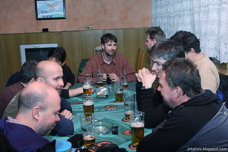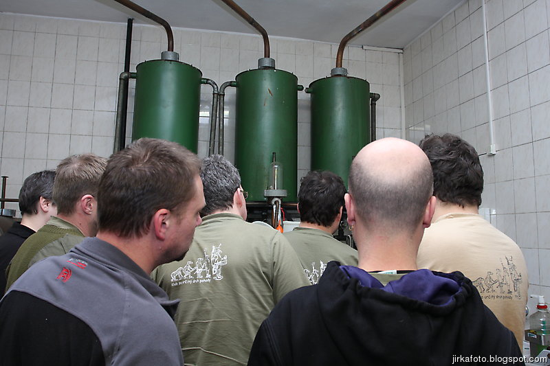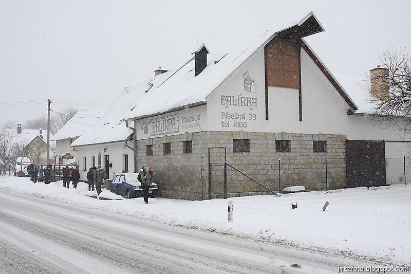 Zastávka Písečná, nás uvítala mírným sněžením a následovalo hledání místní pálenice. Najít ji se nám bez většího bloudění skutečně podařilo a zaplnili jsme celkem útulnou hospůdku. Odnesl to Radegast a opravdu výborná dršťková polévka. Na přivítanou jsme dostali panáčka domácí pálenky. Zase mi vyhládlo, objednal jsem si guláš a byl opět dobrý. Dokonalst kazily jen knedlíky, vypadaly jako ze supermarketu. Kamarádův utopenec byl už jen syntetické cosi. Po opravdu krátké exkurzi nás překvapila absence vzorků vypáleného ovoce, ani nabídka prodeje se nekonala. To nás dost zklamalo. Kouďák si ale stejně našel zábavu, když v televizi napjatě sledoval Simpsnovi a vadilo mu že hlučíme. Paní co nás obsluhovala potřebovala cosi zařídit a namísto naší obsluhy přišla její dcerka. A už se tipovalo, kolik je jí vlastně let. Vypadala docela mladě, i když byla pěkně zmalovaná (tedy v obličeji). S přibívajícím alkoholem v hlavách se množily doslova kacířské názory na přenocování v palírně. Kverulantům se nás zviklat naštěstí nepodařilo.