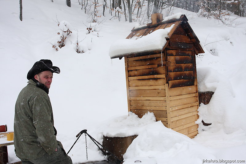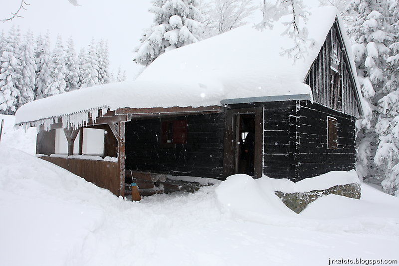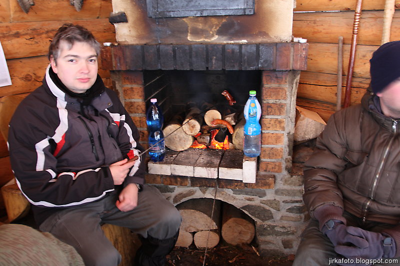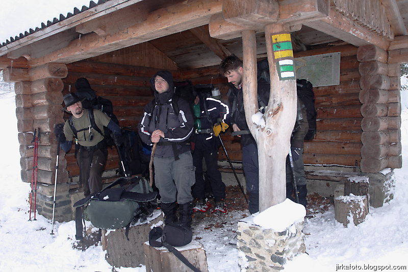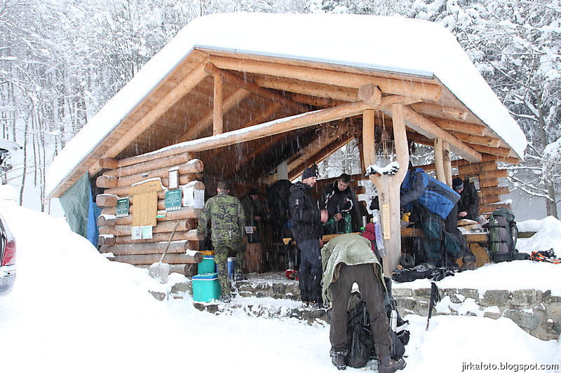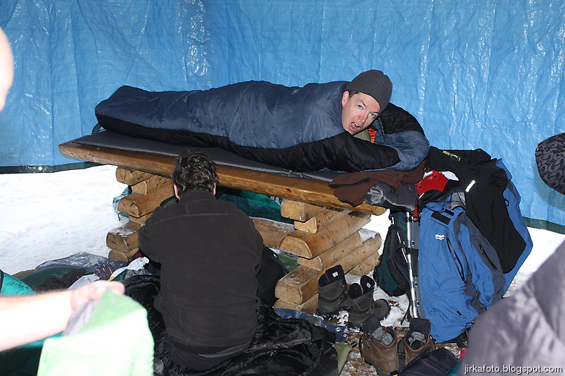 lesnímu baru. Cesta vedla pořád do kopce, tím jsme se pěkně zadýchali a někteří i vystřízlivěli. Po nalezení přístřešku letěli lavice na stranu, někteří z nás si ustlali na stolech, zbytek na podlaze. Venku pořád slabě sněžilo. Vojta spal jako jediný úplně venku. Z noci si toho moc nepamatuju, spal jsem jako nemluvně. Zima mi nebyla, Mandyho spacák opravdu hřeje, jen bych ho snesl o trochu delší. Zajímavé bylo, jak se sráží vydýchaná vlhkost, tak se na spacáku blízko hlavy vytvořila jinovatka.