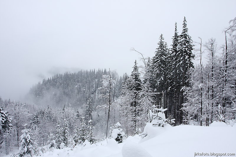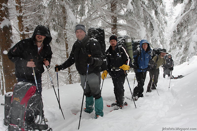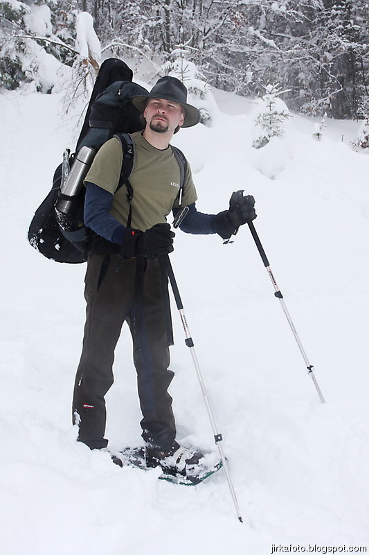 Chůze na sněžnicích je docela nezvyk, zvlášť s batohem na zádech. Už po prvním stoupáku mě začaly bolet nohy, hlavně stehna. Jednak člověk chodí dost ze široka, potom pohorky plus sněžnice, mnohdy i s nějakým tím sněhem, taky něco váží. Tím pádem je chůze v neprošlapaném sněhu docela náročná. No nic alespoň si zaposiluju. Kamarády bez sněžnic, kteří šli z pochopitelných důvodů za námi, jsem litoval. Každou chvíli se bořili do sněhu, mnohdy až nad kolena.
