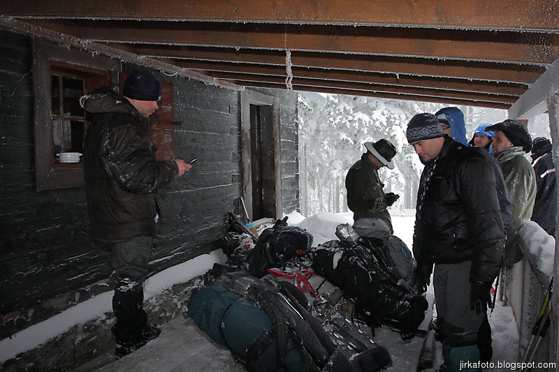 Ráno, krátce po probuzení nás navštívil správce a doslova vojenským povykem nás aktivoval k rychlému balení. Po zatopení v krbu a udírně, uvaření čaje a kávy tady ještě chvíli zevlujeme. Stále sněží. Kolem nás projíždí jeden týpek na skialpech. Po zahnání hladu a žízně není zbytí, nasazujeme na nohy sněžnice a už funíme do opravdu výživného kopce. Po pár kilometrech potkáváme v protisměru slečny s chlápkem co se prohlašuje za jejich instruktora. Podle jeho slov jsou z nějaké křesťanské organizace. Při otázce, kam máme namířeno, velmi důrazně naznačuje, že tam spí oni, a nebyl by od nás dobrý nápad, aby jsme je tam vyrušovali. Až to vypadá na nějakou sektu, ukázková křesťanská pohostinnost. No nic, jdeme dál. U jakési lovecké chaty toho máme tak akorát dost. Nakone tady pro dnešet taky končíme.