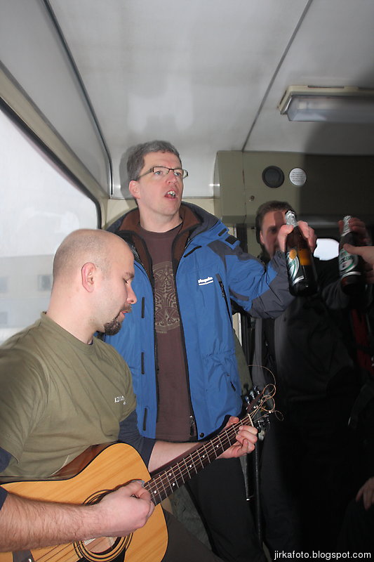 Na vlak jsme cupitali svižně, abychom ho stihli. Zábor zadní nástupní plošiny se podařil, při cestě nás odměnila zajímavým výhledem. V tuším že Lipové nás zaskočil zmatek Českých drah kde rychlík co měl pokračovat dál, tady končil, ale nakonec jsme nastoupili do správného vlaku. Suveréně jsme obsadili kupé první třídy a nechtělo se nám odtud hnout. Kupodivu průvodčí neprotestovala. Nikdo z nás nevěděl kde přestupujeme, zvlášť když vlak měl zhruba 20 minut zpoždění. Po cestě se hrálo, zpívalo a samozřejmě popíjelo.