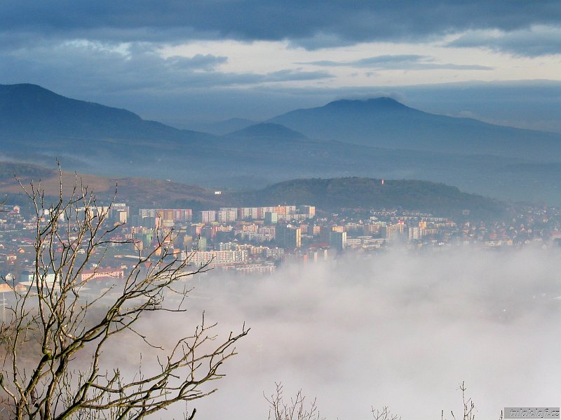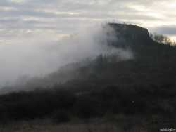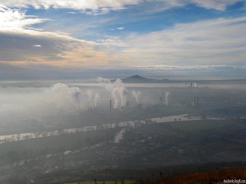Závěr je do slušného krpálu, alespoň tady není lepivé bahno. Dobýváme vrchol. Všude kolem nás je prvotřídní inverze. Ani slunce není vidět. Najednou, jako mávnutím kouzelného proutku, začíná foukat. Mraky mizí, slunce se objevuje a začínáme rozeznávat krajinu dole pod námi. Opravdu působivé. Chemička v Lovosicích v inverzní oblačnosti hnusně čmoudí, jsem rád že tady nebydlím. Vidíme snad celé České středohoří, Házmburk, Říp a z oblačnosti vystrkují komíny Spolana, Kaučuk a Počápelská elektrárna. Fotíme se a když jsme dost nakoukaní jdeme zpátky k našim odpadlíkům. V restauraci na nádraží dáváme lehčí oběd a jedeme vlakem zpátky do vyhřátých domovů.