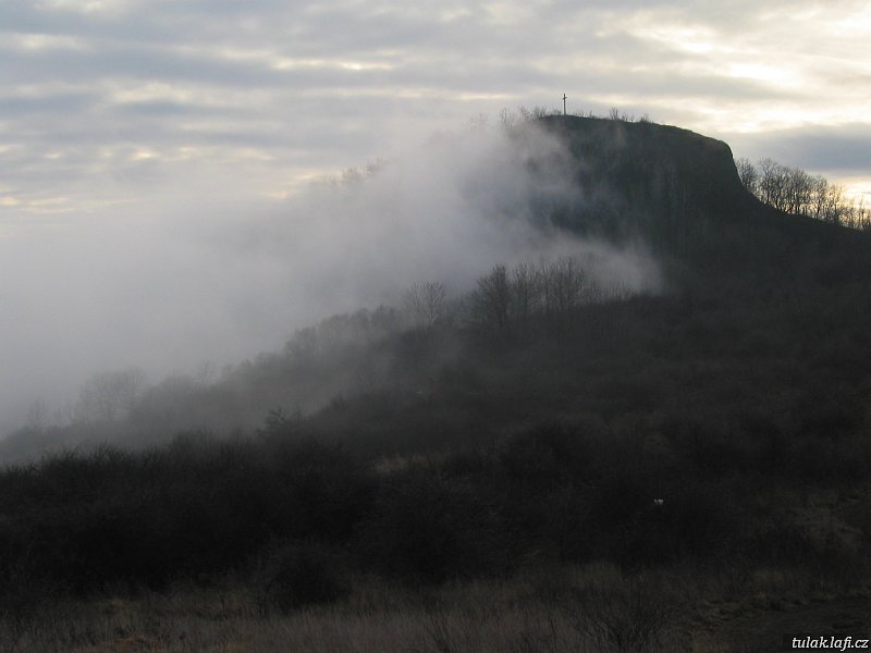 Cesta vlakem byla příjemná, díky pivku a placatce čehosi destilovaného. Naštěstí toho bylo jen tak na chuť a proti prochladnutí. Počasí bylo nic moc. Zatažená obloha, každou chvíli to vypadalo na deštík a mlhavo. Nicméně jsme se hecli. Po příjezdu do Litoměřic odoláváme místním restauracím a jdeme směrem ke správnému kopci, alespoň si to myslíme. U kruhového objezdu nás místní vyvádějí z omylu a ukazují správný směr. Po chvíli poznává cíl cesty i náš vůdce. V pohodě stoupáme až k vysílači pod závěrečným kopcem. Tady začíná ta pravá zábava. Cesta je jedno velké bahniště. Když jsem viděl na nádraží spoluvýletníky v div ne svátečních oděvech, trochu jsem se styděl za své maskáčové kalhoty a pohorky. Tady mi bylo hej. Ti z nás se slabší morálkou zůstávají v základním táboře u vysílače. My ostatní se jdem poprat s bahnem, kopcem a mlhou. Po chvíli plahočení máme na nohách místo bot bahnité koule. Pod výstupem je lavička. Nějací dobytkové před náma ji použili jako škrabák na zabahněné boty.