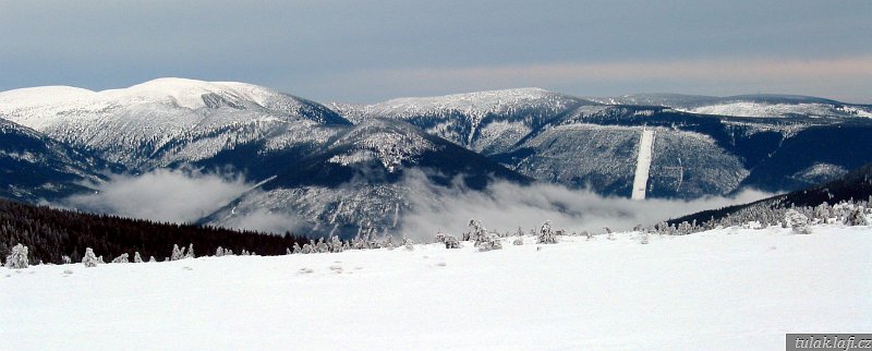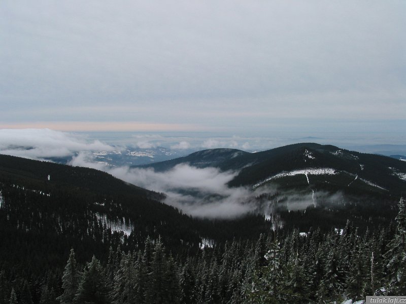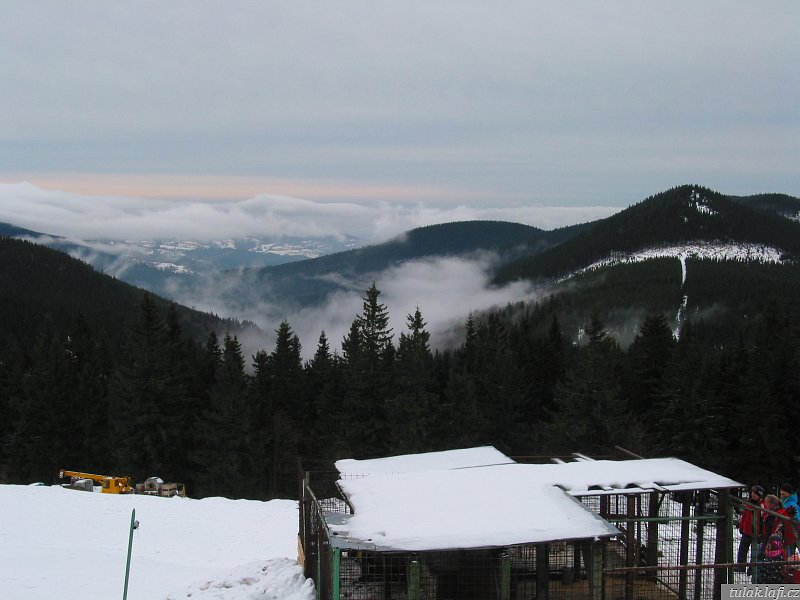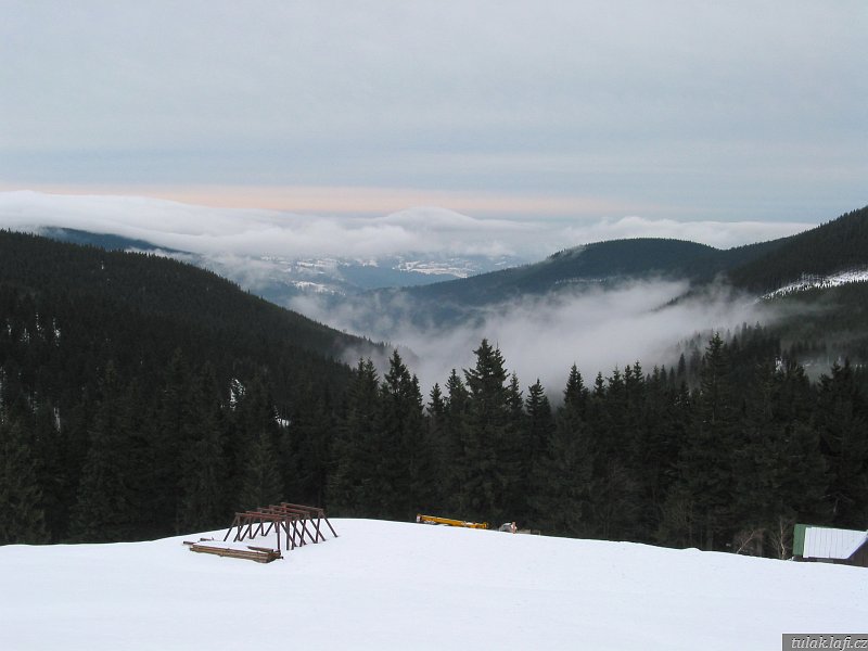 Funíme do kopce po žluté turistické, kam se v zimě normálně nedostaneme. Traverzem míjíme Ručičky a za chvíli nám kříží cestu sjezdovky na Lysé hoře. Potkáváme skupinku starších němců. Mají úžasný talent motat se do záběru fotoaparátu. Z Dvoraček je pěkný výhled na inverzi v údolí. Dáváme něco malého k jídlu a pití a jdeme přes sedlo na Růženčinu Zahrádku. Tady už je i sníh. Na Labské louce začíná lehce profukovat. Hraju si s myšlenkou obléknout si mikinu. Jdeme dál. Když se blížíme k odbočce na Voseckou boudu, Jirka se začíná dožadovat návštěvy pramenu Labe. Prý ho viděl jen pod sněhem. Necháváme se ukecat a míříme k němu. U pramene samozřejmě byly k vidění jen vrcholky znaků měst, kterými řeka protéká. Pro Jirku zase nic. Na zpáteční cestě se nám příroda odměnila hezkým výhledem na Špindlerův Mlýn. To už na pláni slušně foukalo. Ještě že mám kapuci. Nebyl důvod se tady zdržovat, šli jsme dolů, k Vosecké chatě. Dáváme čajík, kluci i něco k jídlu a jdeme směrem k chatě.