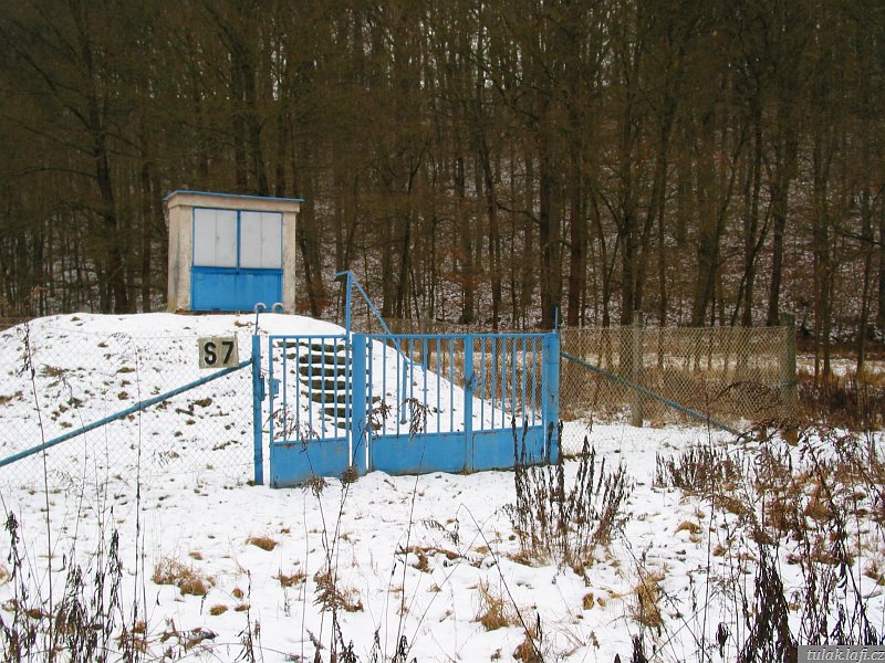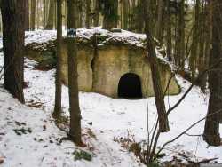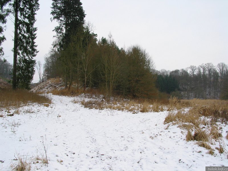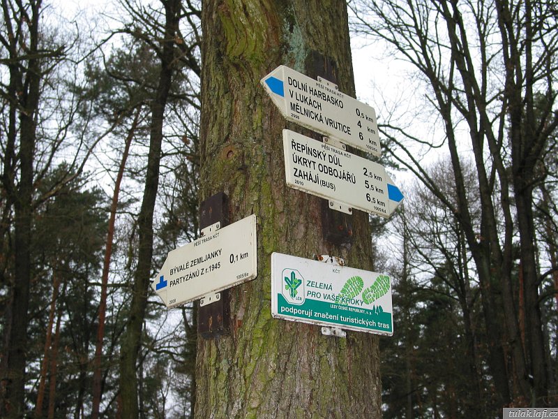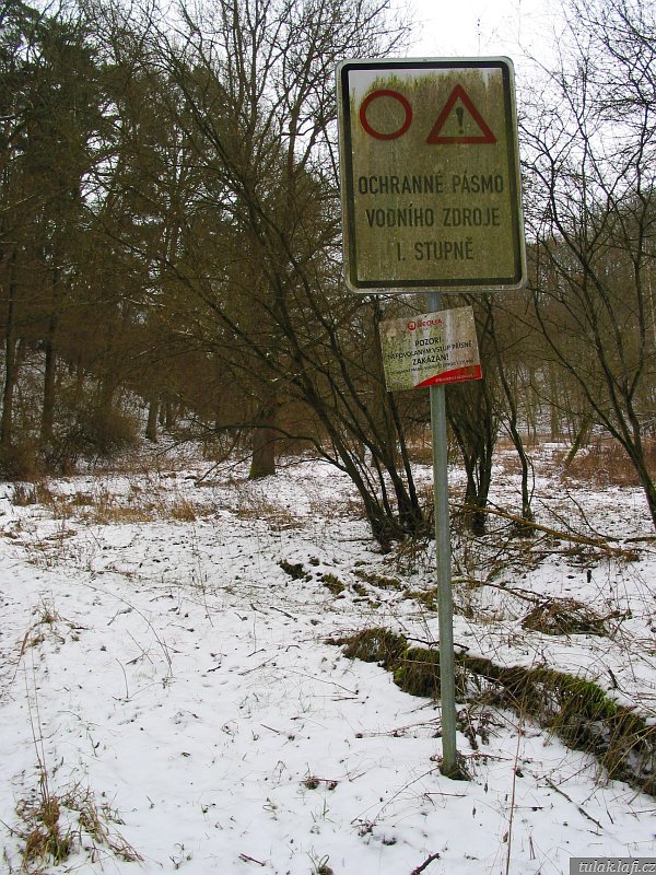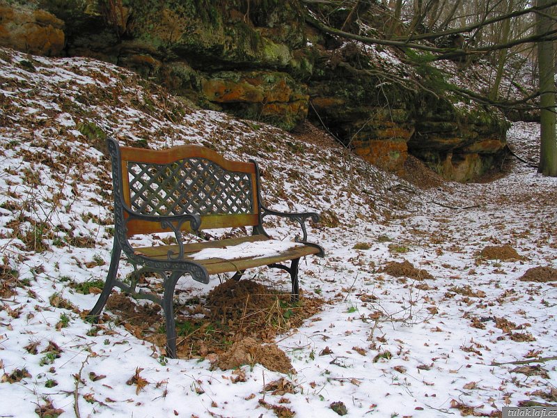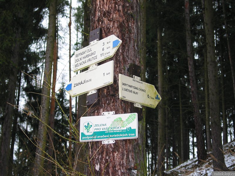 Cestou, u pravé strany údolí vidím výstavní lavičku, úplně svádí k vysedávání. Před koncem doliny se začínají objevovat vodárny. Zezačátku malé, čím dál jdu jsou větší a větší. Nacházím značenou cestu a u ní odbočku k partyzánské skrýši. Nikde nepíší, kolik se jich tady vlastně skrývalo, jeskyně je strašně malá, tak na dva spacáky, a to ještě pro menší lidi. Šlapu dál, cesta začíná být namrzlá. U jedné vodárny mi podklouzly pohorky a málem jsem se natáhnul. Jsem na konci údolí, dál cesta vede po silnici. Naštěstí ne dlouho a modrá odbočuje zase do lesa. A do kopce. Po výstupu dávám pauzu. Nemám nic k jídlu, čaj musí stačit. Dál se těším na jakési zemljanky. Zase mi příjde, že se vleču. Zkouším přidat do kroku, ale moc mi to nejde. Zemljanky jsem sice našel, ale nebýt znaku na kmeni stromu, přešel bych to. V podstatě tam nic není.