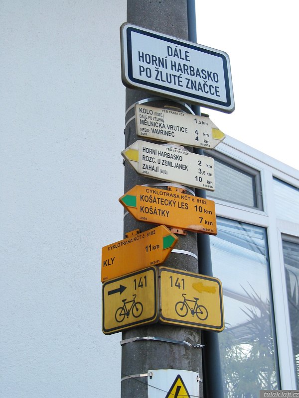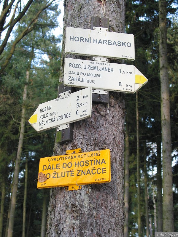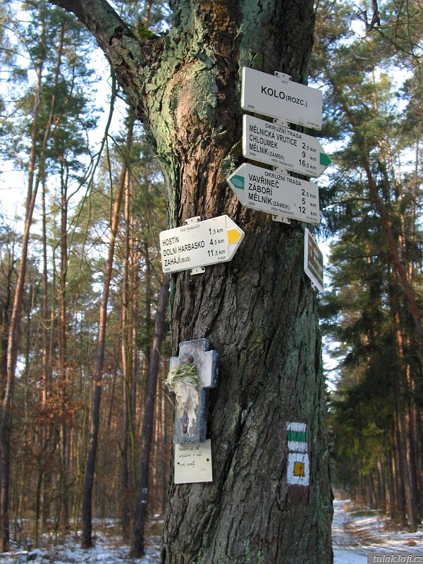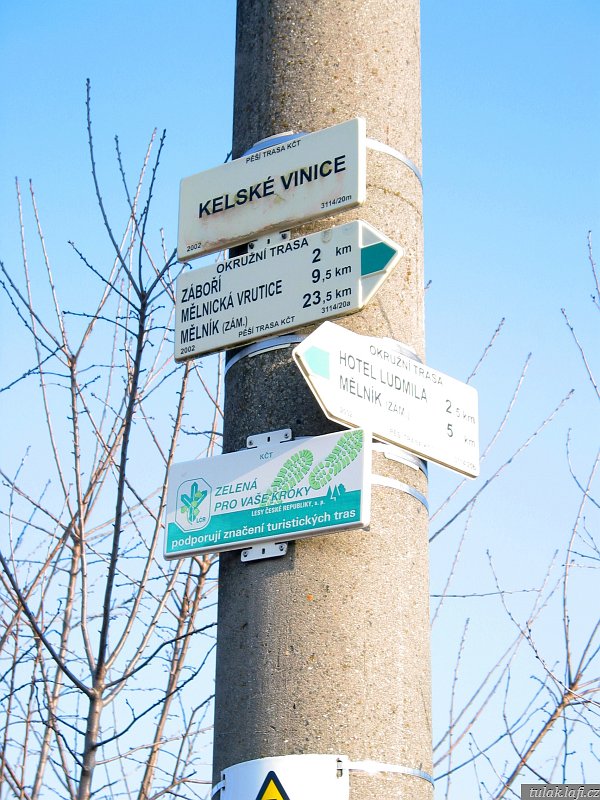 Na rozcestí odbočuju na žlutou do Hostína. Ten přecházím a pokračuju k rozcestí s názvem Kolo. Je čas na další čajovou pauzu. Začínají mě bolet nohy. Pěkně jsi zpohodlněl, říkám si. Od Kola už cestu znám, bloudění nehrozí. Na kraji lesa si pro jistotu protahuju nohy. Mé další kroky vedou přes obec Vavřineč a dál po Skuhrovickém hřbetu. Když vyjdu z lesíka, vidím známé panorama. Kousek pode mnou čadí chemička Spolana Neratovice a o devadesát stupňů vpravo zahlédnu Mělník. Nechce se mi chodit dolů do Záboří a potom zase nahoru. Pokračuju proto cestou kolem lesa přímo k Mělníku. Ve Vinicích zjišťuju, jak mám starou mapu. Turisti posunuli zelenou (turistickou) jednu cestu výš. V otevřené krajině pěkně fouká. Nasazuji kapuci a nakonec i rukavice. Dokonce se chvílemi objevuje i slunce. To je sice hezké, ale jak zasvítí na cestu, která je na jižní stráni, stane se z ní jedno blátiště. Posledních doslova pár kilometrů je výživných.