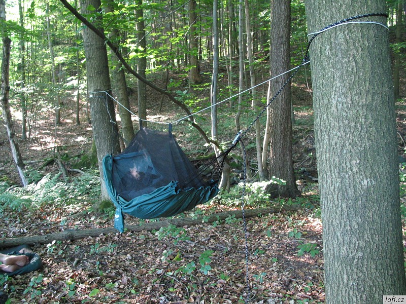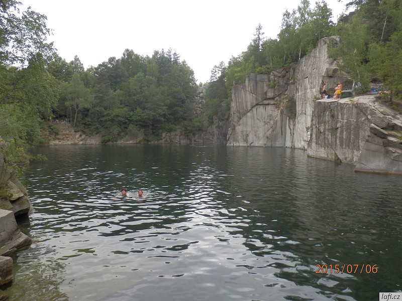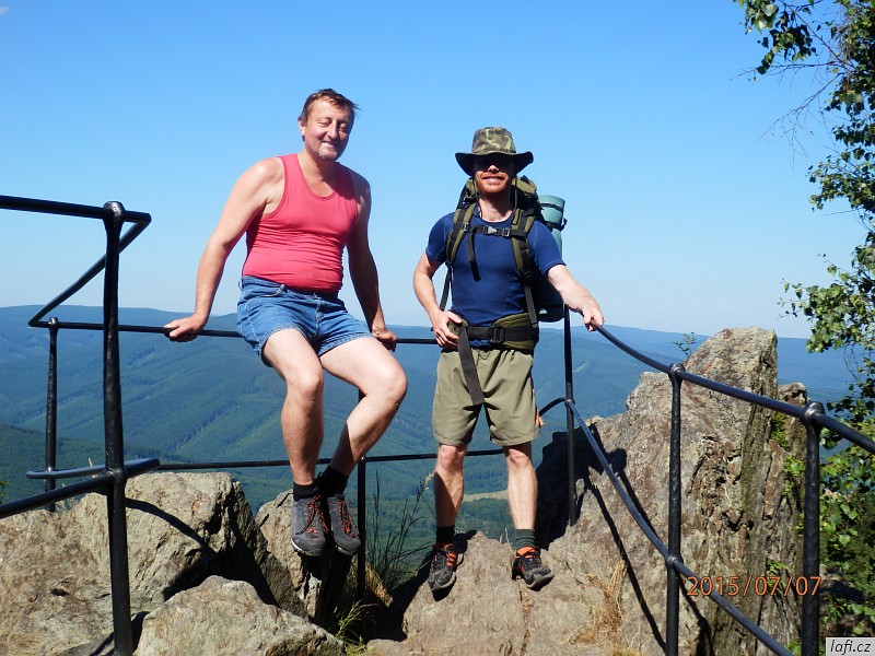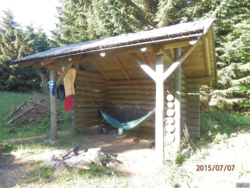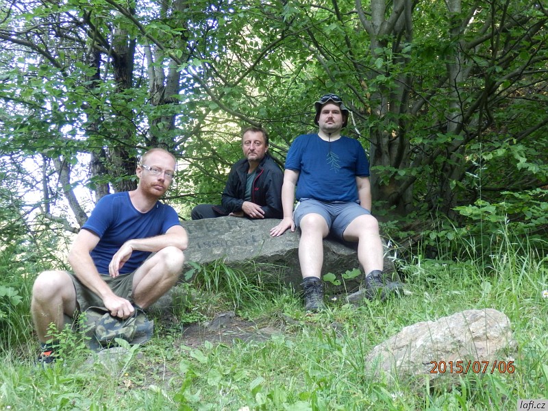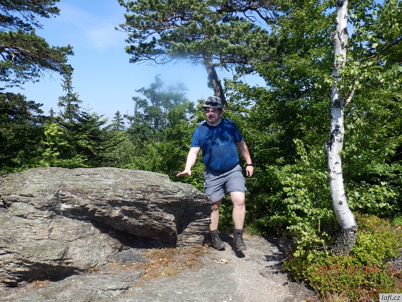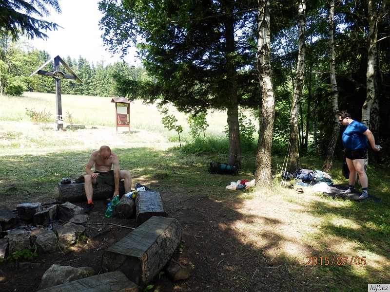 Ráno slibuje opět vedro. Snídáme, balíme a vydáváme se na cestu s vidinou suchého zákona po celý den. Ujo dostává geniální nápad, obejít Špičák po vrstevnici. Nikdo neprotestuje. Odpoledne přicházíme do Skorošic. Poslední kilometry jsou po asfaltu, nic pěkného. Nacházíme zvláštní stavbu se slunečníkem, vypadá jako kiosek, ale je zavřená. Mlsně slídíme kolem, až od naproti jakýsi strýc na nás volá, jestli nechceme pivko. To se ví že jo! :) Otvíráme podnik, za chvíli se k nám přidávají jak místní, tak squadra důchodkyň s mapou z knihovny. Ani se nám odtud nechce. Dokonce nám pan provozní nabízí nocleh v maringotce za kioskem. To by bylo levné vítězství, proto šlapeme dál do Žulové s představou přespání v některém lomu. Po cestě nacházíme hospodu, chvíli se zdržíme, ostatně, jak je na čundru zvykem, není kam spěchat. Na chvíli si odskočím na WC, po návratu koukám,u našeho stolu sedí jakási ženština. To jsou mi věci. Konverzujeme, tedy jestli po těch pivech v tom vedru a na lačno se tomu ještě dá říkat rozhovor. Zaznamenávám slova jako aura, energie,… zřejmě místní vědma, jak poznamenal Jirka. Ukazuje nám cestu k lomu Vaňek, dokonce tam jde s námi se slovy, že bydlí poblíž. Lom je úžasný, sice ne až tak křišťálová voda, ale je chladná tak akorát, koupání po celodenním výsmahu s batohem na zádech je úžasné. Byli jsme pravděpodobně trochu hlučnější, kempující rodinka naproti, zastoupená paní, nás šla umravnit. Ráno na probrání to jistí koupel, a už si to šineme zpátky do Žulové, bohužel po silnici. Je vedro. Po cestě ve Skorošicích v COOPu, kupujeme klobásy na večer. Na návsi v Žulové se necháváme zlákat hospůdkou. Dlouho nezevlujeme, Ujo zavelí k přesunu do jakéhosi rychlého občerstvení naproti. Něco malého do žaludku a už si to šlapeme zase do kopce. Stavíme na koupání v lomu Na rampě. Voda je tu o poznání čistší a taky studenější. Zjištuju puchýře na noze, naštěstí to není žádná tragédie. Jdeme dál, chvíli odpočíváme u hradu Kalkenštejn. Při cestě na Ripperův kámen doplňujeme vodu u Mariina pramene. Pramen je zahloubený v kamenném valu, kde je chládek, téměř zima. Stačí udělat pár kroků a máte přírodní klimatizaci. Turistická značka je zmateně značená, vede do nějakého zeleného, zarostlého, mokrého hnusu. Volím cestu po trailovém cyklo okruhu. Asi v půli kopce zjišťuju, že cesta vede jiným směrem než potřebuju. Obracím se a sprintuju zpátky, kde si stačím téměř vymknout kotník. Zbytek cesty je hodně do kopce, při výstupu se potím jak vrata od chlíva. Dnes spíme na Medvědím kameni. Je to rozcestí na hřebeni, s přístřeškem a ohništěm. Ideální na kempení. Trochu tu profukuje, ale to nám nevadí. Buduju hamaku přímo v přístřešku. Je tu ohniště i se dřevem, opékáme uzeniny, co jsme celý den tahali na zádech. Krátce po soumraku usínáme.
