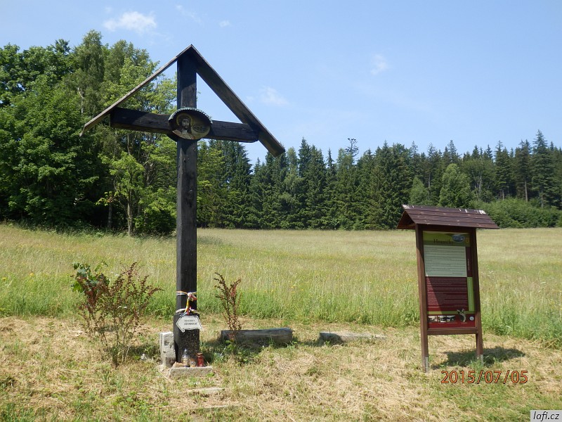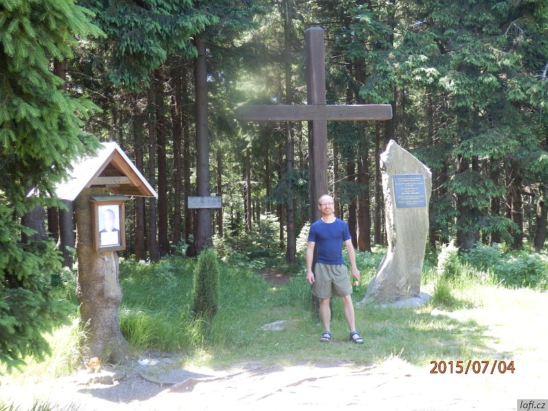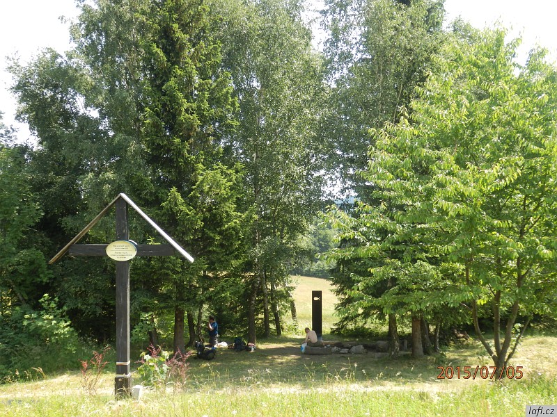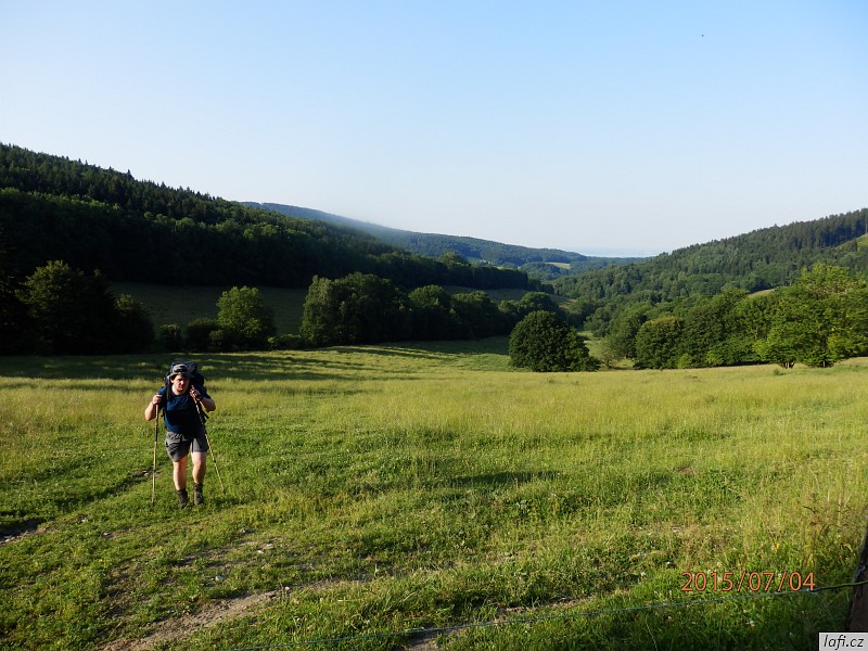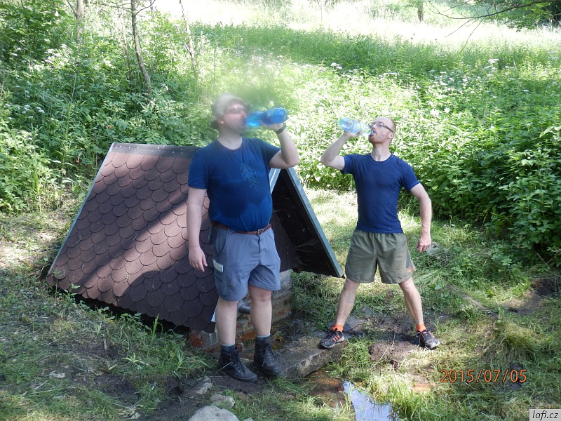 Už čekám na Hlaváku u pokladen na kamaráda, kupuju lístky, ještě stíháme dokoupení zásob v marketu a nastupujeme do vlaku. Dokonce kořistíme sedadla. Jízda probíhá celkem klidně, konverzujeme o všem možném. Časem se přidává další parťák, Ujo. V Javorníku všichni tři vystupujeme na rozpálenou dlažbu. Naštěstí po pár krocích na nás mává vývěsní štít hospody. Bereme za vděk stínem slunečníku. Dokonce tu opékají vepřovinu. K večeru, už mírně veselí jdeme do kopců, najít si nocleh. Kus za hájovnou nalézáme pěkný plácek. Stavím hamaku, jen tak bez plachty. Rozděláváme malý ohýnek, akorát na opečení něčeho ze zásob. Celkem brzy jsme už zalezlí ve spacákách. Houpu se v síti, kousek od nás ševelí malý potůček, až jsem z toho usnul. Ráno je nádherně, v lese je stín a chládek, dokonce se můžeme umýt v potoce. Voda v něm je příjemně ledová. Konec romantiky, batohy jdu na záda a vyrážíme na Borůvkovou horu. Vybírám pro první den jako obuv sandále. Ze začátku jdeme po nenáviděném asfaltu se sílícím sluncem v zádech. Naštěstí to dlouho netrvá a začíná celkem příkrý výstup po lesní cestě. Na rozcestí s vyhlídkou objevuju na nártu klíště, akorát se snaží zakousnout. Jde ven, ještě preventivně místo potírám ajatinem a operace je u konce. Cesta jde kupodivu pořád do kopce. Jsme u rozhledny. Zjišťuju vybité baterky ve foťáku, a to jsem ho před akcí měl v nabíječce, klatě. Dáváme si pivko a limču. Kiosku šéfuje svérázný ukecaný chlapík. Ptám se na studánku, naznačuje že je vyschlá. Jdu se radši přesvědčit, bohužel má pravdu. U občerstvení celkem dlouho zevlujeme, není kam pospíchat. Na slunci je vedro. Odpoledne si líně dáváme batohy na záda pokračujeme po modré turistické směrem přes obec Travná. Při cestě před vesnicí by měla být studánka. Kus od rozcestí Letiště ztrácíme značku a jdeme do pr… Naštěstí Ujo rychle vymýšlí náhradní variantu, zpátky do kopce se nikomu nechce. Ta, světe div se funguje. Pramen Saletta nacházíme u kapličky, jeho voda je prý radioaktivní, ale chutná skvěle a je prvotřídně chladná. Chvíli u studánky odpočíváme, najednou k nám běží hejno děcek s pár dospělýma. Vypadají jak z nějaké sekty. Ve vesnici objevujeme hospodu naším směrem. Pár pivek a něco malého k snědku to jistí. Malou vadou na kráse je absence zahrádky. Ale dost nářků, bágly putují zpátky na záda a jdeme zase nahoru na hřeben. Cesta vede přes louku, podél staré úvozové cesty. Je to přímo ideální místo pro klíšťata. Mám dlouhé nohavice a na nohou tesnisky, snad to bude stačit. Cesta vede pořád do kopce. Nad zálesím je kaplička, kde zvědavý Jirka je do krve kousnut hovadem. U studánky Koníček potkáváme dvojici s batohama. Jdeme dál. Kempíme v lese, někde u Černého vrchu. S velkou opatrností rozděláváme malý ohýnek na opečení zbylých zásob. Snažíme se ujídat nejtěžší potraviny. Znovu spím v síti, tentokrát mám problém s uvázáním. Provázky se mi pořád povolují. Nakonec dělám na každé straně uzel navíc a je vyřešeno. Před zalezením do spacáku nalézám na boku zahryzlé klíště. Ještě není nafouklé, beru pinzetu, ale nechce se pustit, prevít. Pro lepší viditelnost mi Ujo přisvěcuje čelovkou. Nakonec se nasírám, beru klíšťáka mezi nehty a zbavuju se ho.