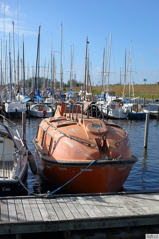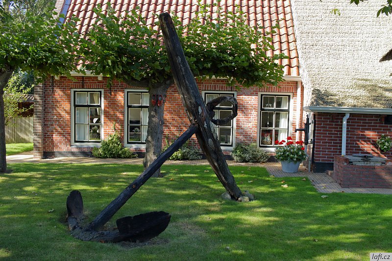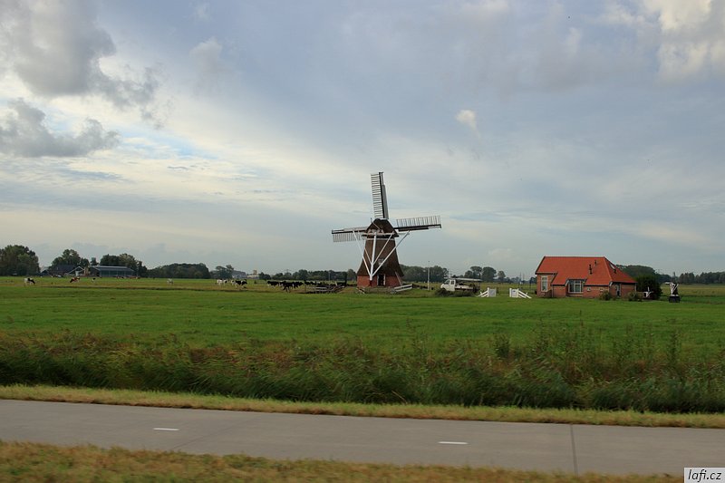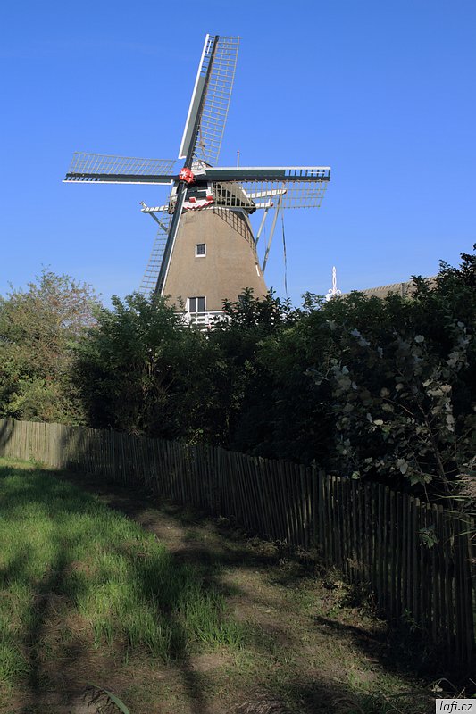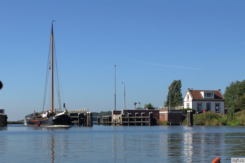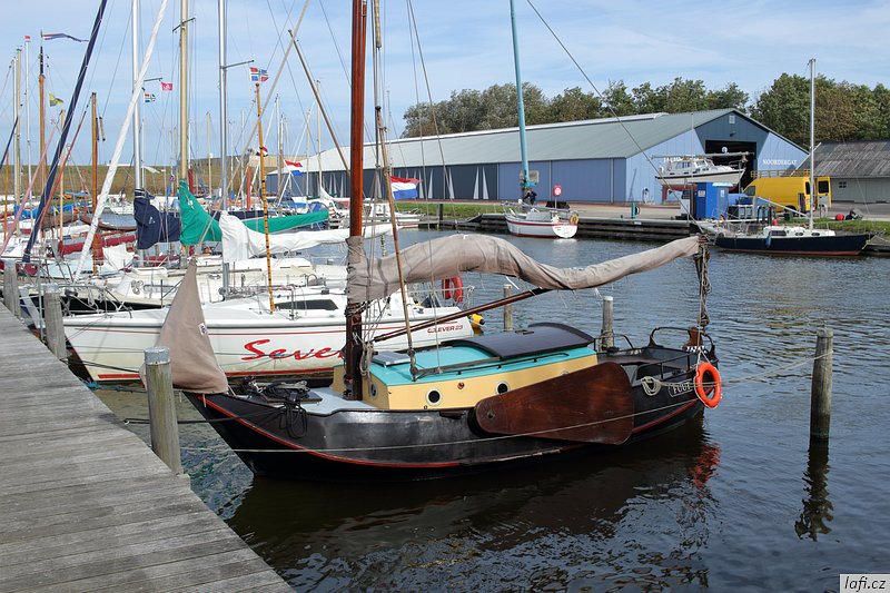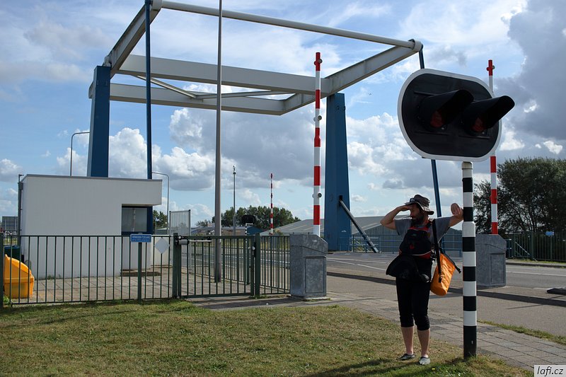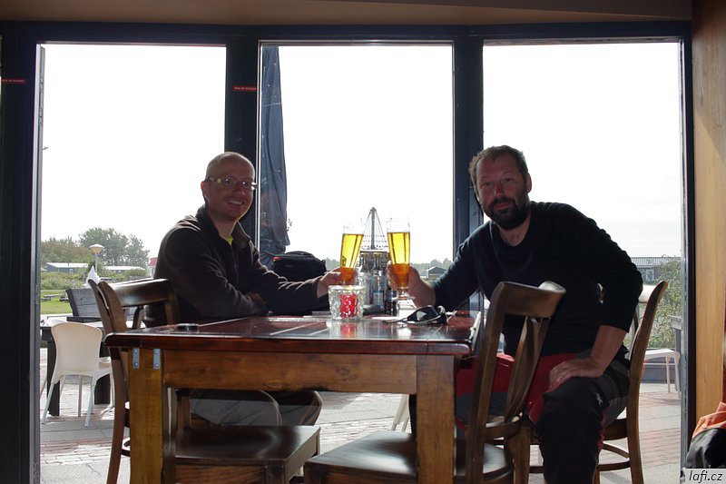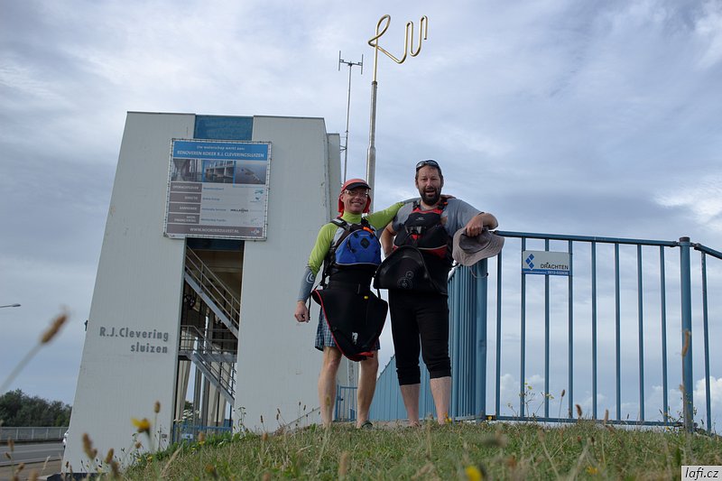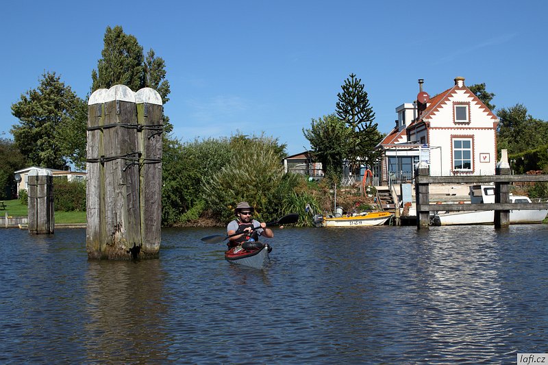 Ráno už jsme při balení rychlejší, skáčeme do lodí, necháváme si otevřít vrátka a pádlujeme, tentokrát už správným směrem. Podle internetu je v pondělí rybárna zavřená, ani se neobtěžujeme vylézat z kajaků. Už od včera si zvykáme na čilý provoz na řece. Je krásně, ale ne vedro, ideální počasí na pádlování. Vplouváme do delty řeky a mezi ostrovy se proplétáme až k hrázi, co odděluje řeku od moře. Taháme lodě na břeh a zkoumáme, kudy se dostaneme na druhou stranu. Objevujeme zdymadla, hurá. Pádlujeme k nim, za námi pluje velká loď, vrata se otvírají a vplouváme. Není to nic pro klaustrofobiky. Konečně jsme na moři. Zdravíme se s ním, nečekáme a pádlujeme přímo na ostrov s nevyslovitelným názvem Schiermonnikoog. Někde za půlkou cesty Míra pronese: Hele, to je divný, ty ptáci stojí ve vodě . Skutečně, za chvíli pod kajakama nemáme dost vody ani na pádla. Bereme nejkratší cestu k plavební komoře označenou bójemi a tím si cestu dost prodlužujeme, prže potřebujeme obeplout velkou písečnou dunu. Bóje nás dovádějí k přístavu trajektů. Posledních zhruba 100 metrů pod loděmi už nemáme vodu, přenášíme je po bahnitém dně na břeh. Ze včerejšího i dnešního pádlování jsem unavený, přece jen je to nezvyk pádlovat s naloženým kajakem přes 30 kilometrů denně. Kempíme rovnou v přístavu, jednak proto, že je celý ostrov ptačí rezervace, druhak se nám už nikam nechce. Tedy mě se nechce. Obhlížíme malý přístav, jdeme se projít na ostrov, hrajeme si s myšlenkou půjčit si kolo a prozkoumat ho. Nakonec se shodujeme, že zítra pádlujeme dál, k ostrovu Ameland. Ráno, za začínajícího odlivu vyplouváme. Na moři je to fičák, nepotřebujeme skoro vůbec pádlovat a plujeme jako namydlení. Včerejšek nás naučil volit si trasu podle bójí, co vytyčují plavební dráhu. Jinde není dost vody ani pro naše kajaky. Navigace z kajaku se stává obtížnou, sedíme nízko, na obzoru je opar, nízké ostrovy v něm nejsou vidět buď vůbec, nebo jen náznaky. Mapy mám až navazující oblasti. Udělat si náměr a jet podle kompasu tady nefunguje, při vyhýbání se mělkému moři pořád kličkujeme. Jak se blížíme pevnině, odliv nabírá na síle. Odhadem kilometr od pobřeží jsme na suchu a moře se dál ztrácí. Teď už nemůžeme ani zpátky. Pro takové případy vzal Míra svá nová kolejda. Tahat naložené lodě, byť na kolečkách, po bahnitém dně je fuška. V takovém terénu jsou mé kroksy boty nepoužitelné. Každou chvíli mi bota zůstane uvězněná v bahně. Jsem z toho otrávený, unavený a zabahněný. Lodě taháme na jakési molo a odpočíváme. Převlékáme se do civilu. Je hezky, jdeme se civilizovat do vesnice. Pořád mi nesedí tvar pobřeží s mapou ostrova. nevydržím to a aktivuji GPS v mobilu. Do Prčic, my nejsme na Amelandu, ale na kontinentě u jakési vesnice Paesens-Moddergat, zjišťuju skutečný stav věcí. Alespoň tady mají větrný mlýn a rybářské muzeum. Máme dost času, moře na půl dne zmizelo, mrkneme se tam. Aby toho nebylo málo, podle předpovědi má zítra sílit vítr až na 8 metrů za sekundu a pozítří ještě déšť. Při procházení vesničky si zvykáme, že se tady všichni zdraví. Nezbytné hi se stává až otravným. Domky i zahrádky tady mají příkladně udržované, místy až kýčovité. Malé plůtky, chodníčky, úzké silnice. Okna mají většinou bez záclon, nebo žaluzií. Ještě cupitáme k mlýnu pro nezbytné foto. Z toho chození, ať už po mořském dně, nebo tady ve vesnici mě slušně bolí nohy. Hospoda otvírá až v pět. Vzdáváme to a jdeme zpátky k lodím. Vaříme jídlo, popíjíme víno z vlastních zásob. Na molu je celkem provoz, každou chvíli se někdo místní dává s námi do hovoru. Postupem času už máme naučené odpovědi, otázky jsou pořád stejné. Holanďani, jak zjišťujeme, jsou hodně přátelští. Večer navrhuju, abychom nocležiště rozdělali na druhé straně cesty, které se mi zdá o pár centimetrů výš. Ještě zjišťuju předpověď počasí, zítra má foukat, pozítří foukat a pršet, popozítří to samé. Je to na pytel. Pořád zvažujeme přepádlování na Ameland. Konečné rozhodnutí necháváme na ráno.