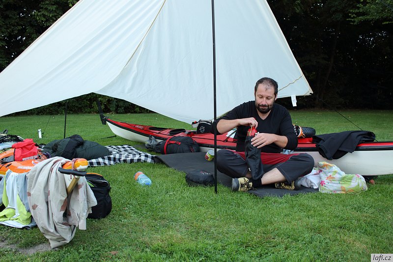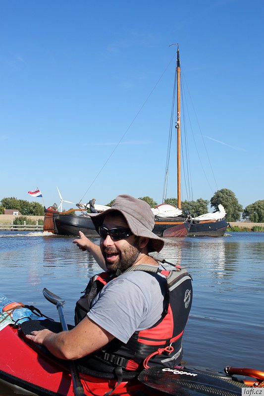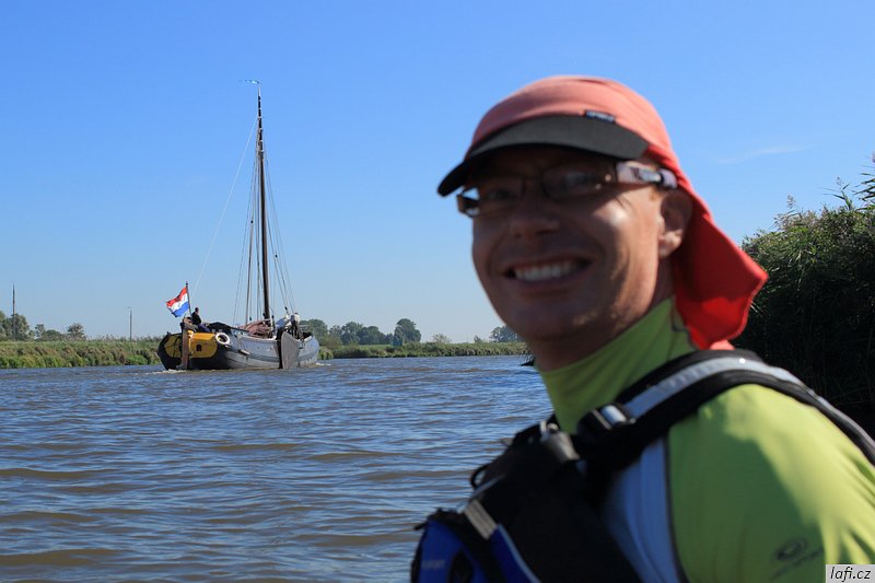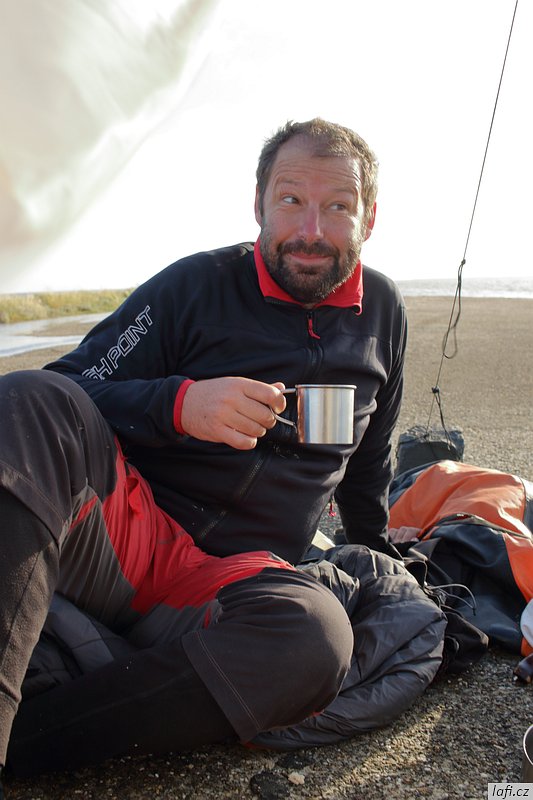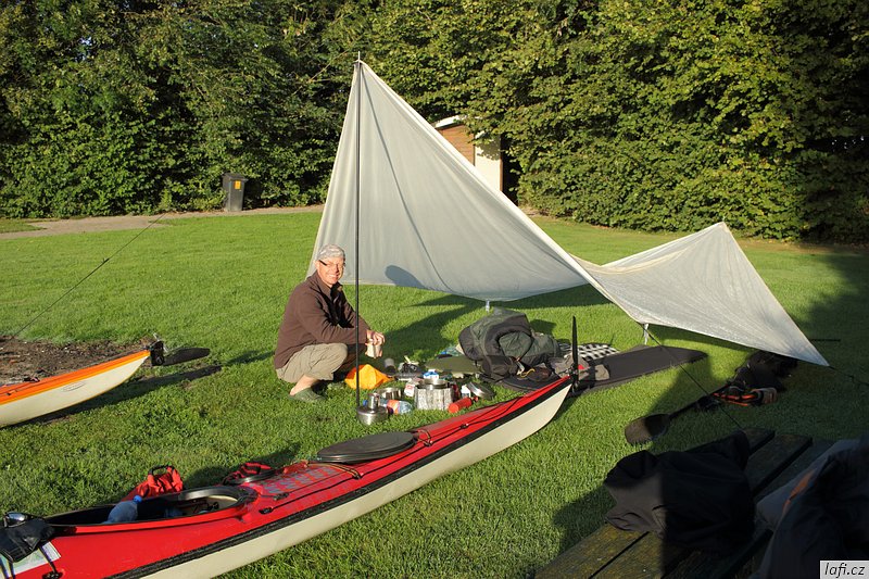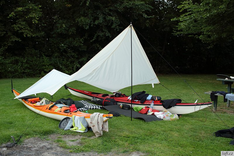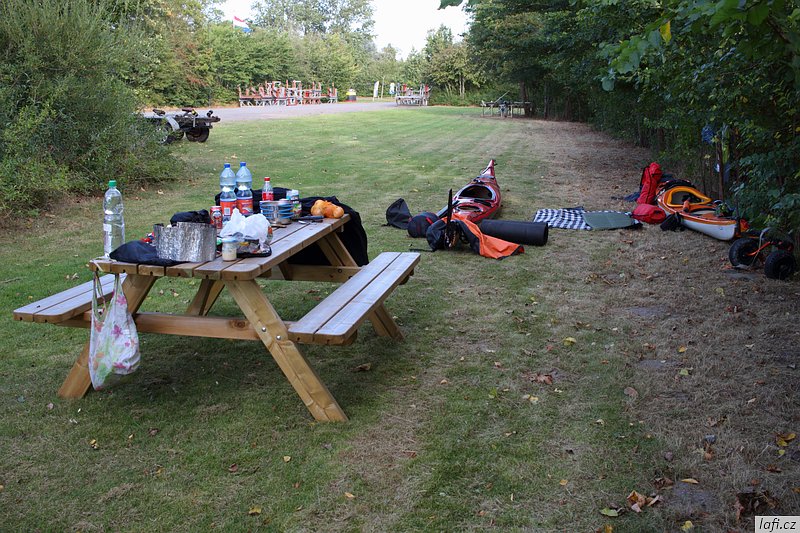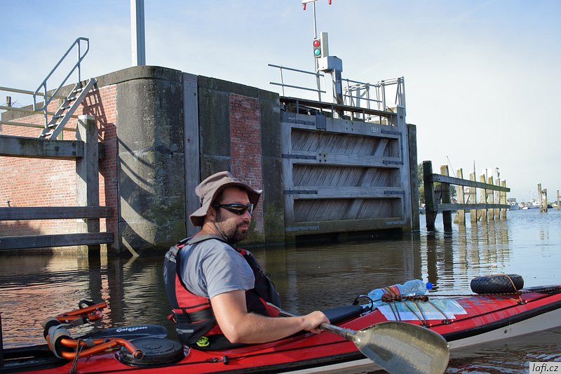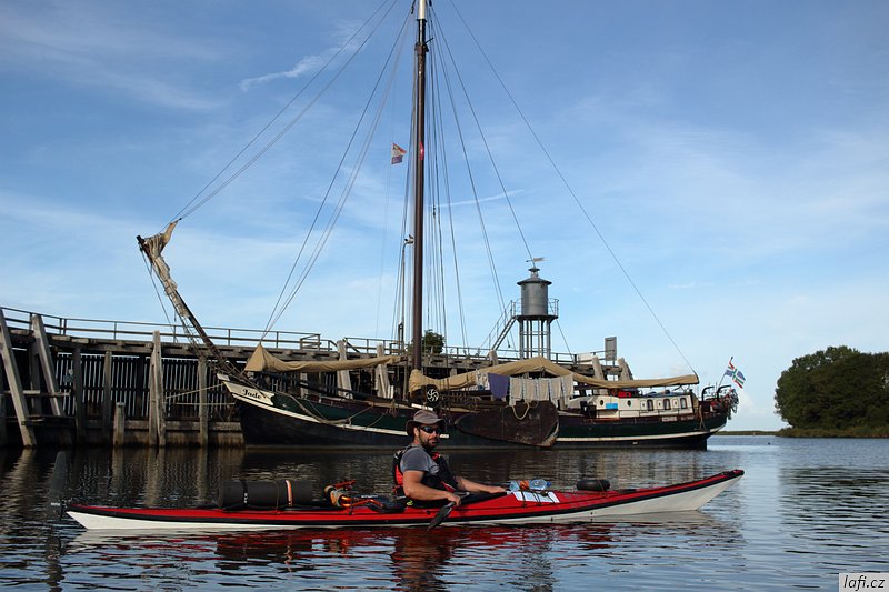 Ráno snídáme, sušíme spacáky na slunci a pomalu se schyluje k mé neoblíbené činnosti, prvnímu balení do kajaků. Zjišťuju, že táhnu spoustu jídla. Část nechávám v autě. I tak je loď dost těžká. Dnes je víc než vhodné vypít plechovku tupláku Faxe, co jsem koupil ještě na benzínce. Spouštíme lodě na vodu a odrážíme. Mám novou šprajdu od Stanďocha, je skvělá. Plujeme kolem diesel přečerpávací stanice Electra dál, jak si myslíme po proudu do Zoutkampu. Po chvíli mi přijde zvláštní, že nám slunce svítí spíš do obličeje a řeka se zužuje. Pádlujeme dál. Před námi se objevuje městečko. Jediná civilizace co podle mapy má být mezi námi a mořem je Zoutkamp. Přivazujeme kajaky k molu a jdeme se podívat na souš. Míra nadšeně říká cosi o obchodu s čerstvě grilovanými rybami. Po krátkém hledání, rozhovoru s místním mládencem a konečné porovnání naší polohy s GPS zjišťujeme, že jsme úplně jinde. Jak už zřejmě tušíte, jsme zhruba 16 kilometrů proti proudu ve městě Garnwerd. Jak to, že jsme minuli řeku? Vždyť u kempu je jen slepý kanál? Záhadu nám objasnila až mapa v mobilu. Po levé straně, hned za přečerpávačkou, jsou malá zdymadla a do nich je svedená celá řeka. To je možný snad jen v Holandsku. No nic, pádlujeme zpátky. Ještě před nasednutím do lodí se s námi dává do řeči jeden Holandský postarší pár a chlápek nás odrazuje od pádlování na Wadensee. Podle něj je to Very dangerous . No, uvidíme. Pozdě odpoledne doplouváme na místo, kde jsme ráno začínali. Už po cestě se mi nelíbí obloha, vypadá to na bouřku. Míra chce tábořit alespoň kousek dál. Tábořiště za parkovištěm, kde máme auto se mi ale zdá ideální. Je kryté stromy před větrem ze všech stran, má záchod i umyvadlo. Nakonec přeci jen kempíme na stejném místě, kde jsme vyplouvali. Je to potupa. Zvedá se vítr, trochu sprchne, jsme rádi, že máme plachtu nad hlavou a nefouká tady.