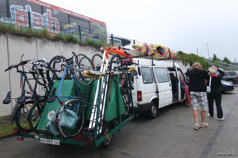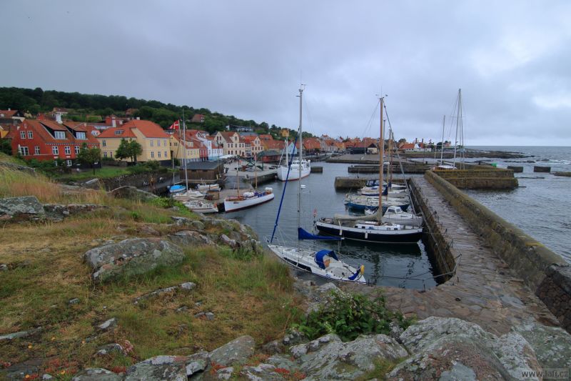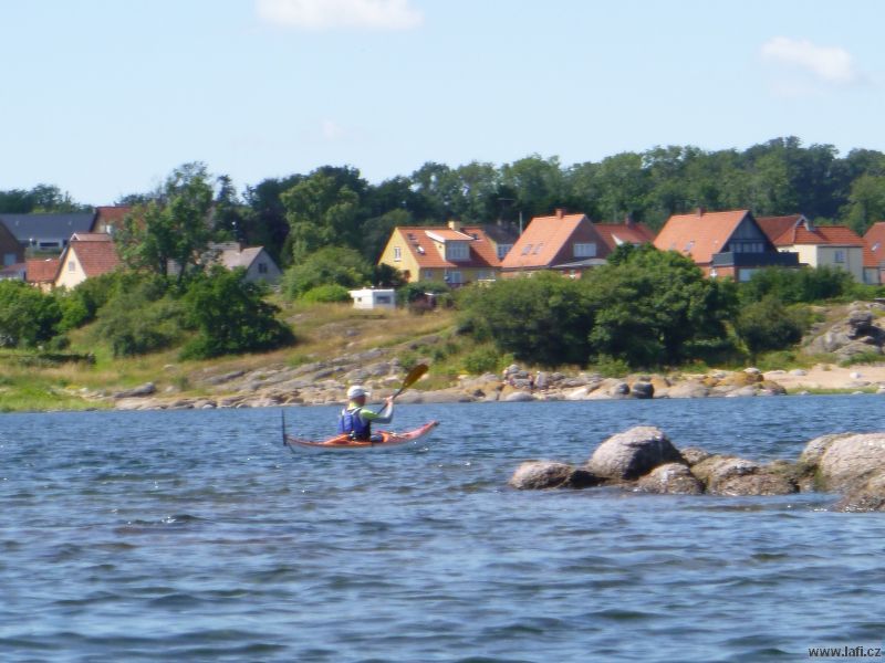 Na tenhle Dánský ostrov mezi Polskem a Švédskem jsem se dost těšil. Severní kraje mám radši než lidmi přeplněné středomoří. Nakonec se vše podařilo a s Vikingtourem jedeme postarší dodávkou přes Rujánu, trajektem do ostrovního přístavu Røne. Cestu nám zpříjemňuje hlas jakéhosi prý známého moraváka, kterému téměř nerozumím. Od něj valíme přes ostrov na protější stranu, kde jsme ubytovaní v kempu u městečka Gudhjem. Pobyt v kempu je pro mě neskutečným komfortem. Záchody, teplá voda ve sprchách, k dispozici dva velké stany, každý pro čtyři lidi. V nich je lednička, nádobí, plynová plotýnka na vaření, neskutečné. Za to moře nás přivítalo větrem, deštěm a vlnami. Poflakujeme se po přístavu, místní oblizují zmrzlinu a vypadá to, jako by jim počasí nevadilo. Cyklisti jsou v pohodě, jen si přibalí pláštěnku a frčí. U nás kajakářů je to složitější. Nejdřív se potřebujeme dostat bezpečně na moře. V takových vlnách je to dost o hubu. A nikde krytá zátoka, jen pár kilometrů od nás se krčí malá marina. Tak snad tam. Při obhlídce Pepa zjišťuje, že spuštění lodě v přístavu je zpoplatněné. Tak snad to neplatí pro kajaky.