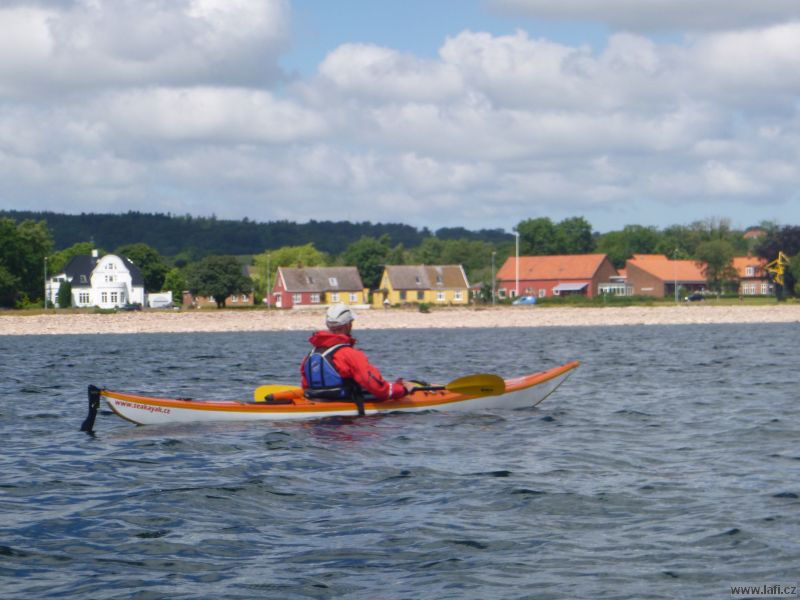 Vítr se stáčí, neváháme a necháváme se cyklistama odvézt na nižní část ostrova, pod město Snogebæk, s tím, že dopádlujeme až do kempu. Pokouším se pádlovat až na jižní mys, ale jak se dostanu ze zátoky, dostávám facku v podobě vln a nepříjemného větru. Nic v čem bych chtěl strávit několik dalších kilometrů. Obracím a po čase dojíždím kamarády. Občas piknikujeme na plážích. U jednoho zastavení začínám oceňovat suché kalhoty. Dají se jednoduše svléknout, člověk si lehne na deku a může se slunit. To u neoprenu, co má Pepa jde o poznání hůř. Zdá se mi, že pádlujeme dost pomalu. Když kotvíme ve Svaneke, máme tam vychytaný fish and chips, je půl dne za námi. A to nás čeká trocha větříku a vlnek proti nám, celou cestu až do kempu. Časově mi to vychází, že budeme v kempu, když to dobře dopadne kolem osmé večerní. Ještě že je tady dlouho světlo. Svým odhadem nechci znervózňovat kamarády, zvlášť když jsou ověšeni nejmodernější elektronikou. Ploužíme se na lodích dál, Pepa s Irinou dávají zátoky vesměs „na komoru“, tudíž nejkratší cestou. Nejkratší ovšem mnohdy neznamená nejlepší. Na moři, kde pádler není krytý břehem, většinou víc fouká a to dost zdržuje postup. Vlastně o nic nejde, jen si déle počkám. Na poslední přestávku vybíráme jedno bezva místo, které jsme objevili na naší první plavbě z kempu. Jak slunce putuje k obzoru, začíná zima. Ještě že jsem vzal vařič. Teplé sousto dělá tělu dobře, stejně tak hlt Pepova čerta. Mysl je klidná, odtud do kempu cestu známe. Jediná nepříjemnost na zbytku cesty je pádlování přímo proti zapadajícímu slunci. Člověk před sebou skoro nic nevidí, kšilt vám nepomůže, prže slunce je těsně nad obzorem, je to na pikaču. Ideální na zánět spojivek. Tmavé brýle jsem si samozřejmě nechal v kempu. Dopluli jsme v pořádku, severní moře mě nepřestávají fascinovat.