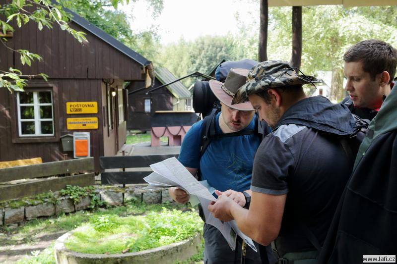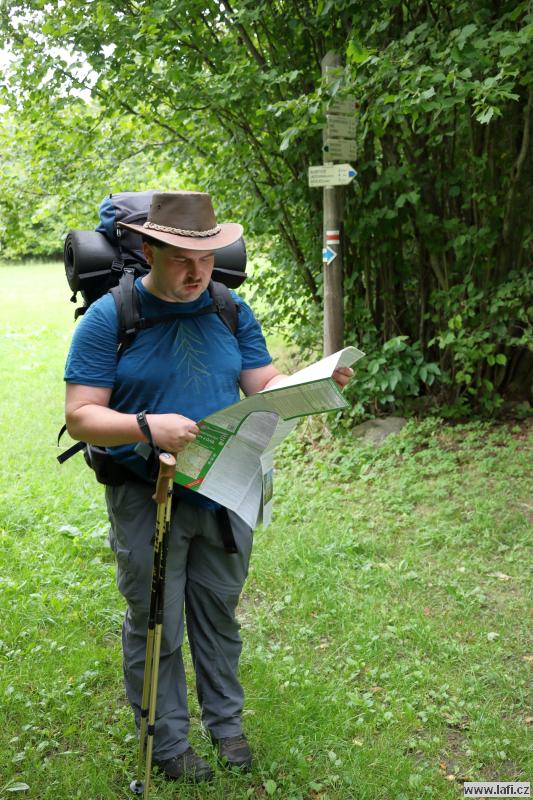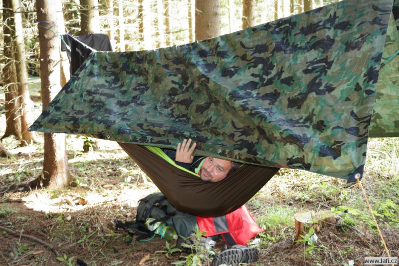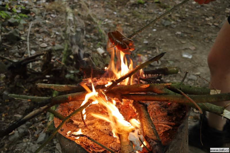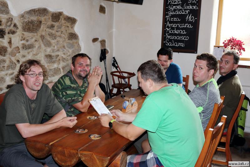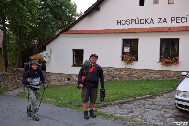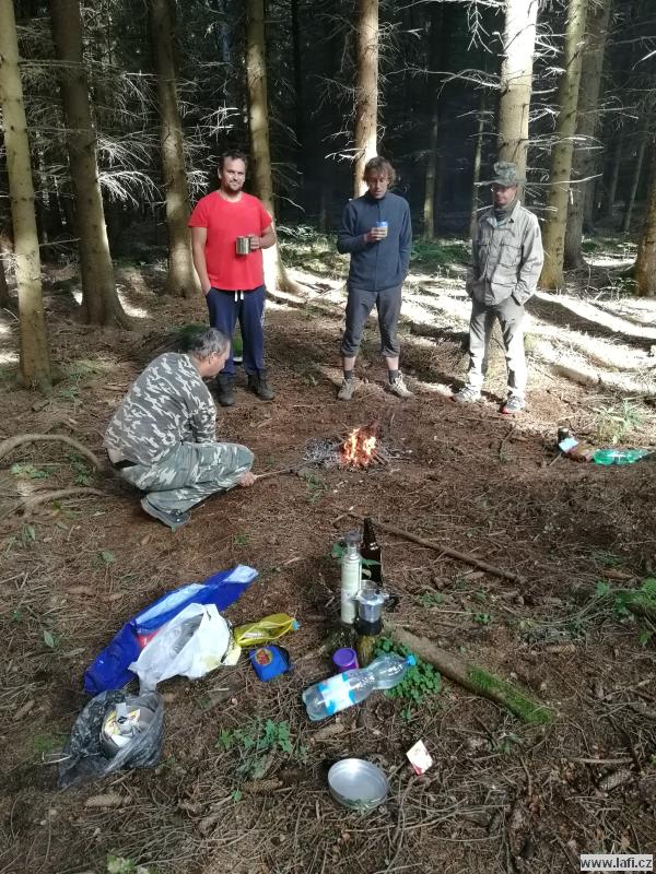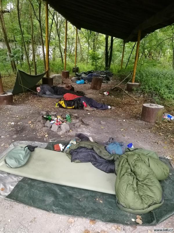 Na cestě ke zřícenině s originálním názvem Na Hradě, po zhodnocení morálky mužstva, začínám přemýšlet, kde si dnes usteleme. Ideální by bylo dojít do Veletína, měla by tam být vyhlášená Hospůdka za pecí. Ale je to ještě nějaký kus cesty a po výšlapu na zříceninu začínám pochybovat, že tam dneska dojdeme. Kluci ale začínají podávat neskutečné výkony, zvlášť při zmínce restauračního zařízení. Jen doufám, že má otevřeno. A skutečně, vcházíme do hospody. Příjemné prostředí, výdejní okénko, možnost si dát i něco lehkého k jídlu, bezva. Za mě máme dnes splněno, o místo noclehu se přestávám zajímat. Jirka pořád řeší zprávy od manželky. Začíná se stmívat, kdosi vymyslí jít po neznačené cestě. Nápad slibuje noční bloudění po okolních lesích, proto bez váhání souhlasím. Začínají se ale ozývat nespokojené hlasy, které by si radši ustlali co nejdřív, ignorujíc romantickou procházku po setmělém lese. Nebereme je vážně. Docházíme na nějakou hlavní silnici, ze které po chvíli odbočujeme vpravo. Jdu za s důvěrou klukama, zvlášť když jeden z nich třímá v rukou mapu a za nastávající tmy každou chvíli do ní upřeně hledí. Hlasy, nespokojené s vedením sílí. Tady se začínají lámat charaktery. Po dalších okamžicích i nejotrlejší z nás vzdávají pokračovat v cestě a táboříme v lese, za křížením cest. Po prvním vychladnutí emocí putuje od úst k ústům ohnivá voda na znamení smíření. Mandys nám ještě pouští pohádku na dobrou noc a jdeme spát. Ricco nezklamal a rozšířil naše skromné řady síťařů, lidí, co spí v hamakách. Dobrá práce, Ricco!