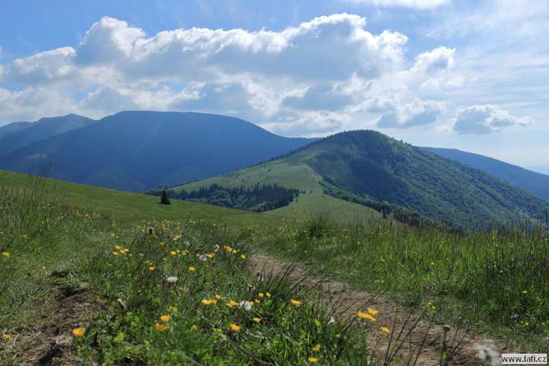 Setkáváme se, jdeme na pivko a za chvíli už jedeme směrem k horám, přes noc, v lehátkovém vagónu. Kluci vedle v kupé objevují jakési ženy, nápadně připomínající učitelky. Ani nevím, jak k tomu došlo, už během prvních chvil jízdy jsou všechny zásoby alkoholu vypité. Ještě že borovičku nemusím, to mě zdá se, zachránilo. Budí nás slunečné ráno, z vlaku máme nádherný výhled na kopce. Ani se mi nechce uvěřit, že na podobný vystoupáme. Rozhoduju se a jdu s klukama jejich šílenou trasu. Jirkové to mají jako tréning na Rumunsko. Ještě že tam s nima nejedu, říkám si. Ujo se od nás v Ružomberoku odtrhává a jede busem do Liptovské Lúžné. My ostatní se posilňujeme v kiosku a míříme do Donoval. Je krásné počasí, v lese je příjemně a nás čeká jen cesta do kopce. Ještě že nevím, kam až potřebujeme dojít, jinak bych z toho jistě dostal splín. Jirka nám se svými dlouhými nohami podle očekávání mizí za obzorem. Se Špágrem nespěcháme, není dobré přepálit začátek. Na každém kopci se kocháme, svačíme, fotíme. Sestup z Kozího Chrbáta do Hiadelského sedla je peklo. Tady prvně lituju, že jsem si nevzal pohorky. V nízkých běžeckých botkách je to záhul na kotníky. V sedle, v bivaku, obědváme. Potřebujeme si odpočinout, zvlášť když jsme při sestupu viděli kopec, na který máme vylézt. Vůbec se mi nahoru nechce, naštěstí nevím, co nás čeká. Výstup na Prašivou nemá konce, převýšení kolem 600 metrů je znát. Začínám mít nouzi o vodu, v sedle jsem si měl u pramene naplnit lahev, vyčítám si. Nahoře si vychutnávám odpočinek, svačinu, slunění a potřebný stečing unavených svalů na nohách. I tak se nedočkávám kamaráda, co jde za mnou. Chochule se mi pletou, nicméně stále jdu. Už je odpoledne, potřebujeme dojít do chaty, což je ještě pořádný kus cesty. Pod jedním kopcem se potkávám s dlouhonohým Jirkou a společně jdeme k Sedlu pod Skalkou, kde se na hřebenovku napojil Ujo. Cestovat s ním mi připadá spíš jako poklus, než pohodová chůze. Na rozcestí odpočíváme, svačíme, větráme nohy. Po delší chvíli Špágr přichází, hurá. Klasický syndrom posledního, my bysme nejradši pokračovali, ale kamarád si pochopitelně potřebuje odpočinout. Chvíli ještě zevlíme, mezitím Špágr usíná. Probouzíme spáče a jde se dál. Přistihuju se, že chodím už automaticky. Přestávají mě znervózňovat výhledy na kopečky před námi, na které hodně pravděpodobně vystoupáme. Ty skoro kruhové rozhledy na každém kopci jsou pro mě novinka. Nikde žádný les, co by bránil kochání se, jen tu a tam zakrslé borovice. Obzor je v modrém oparu, nemá cenu fotit krajinky do dálky, nic by z toho nebylo. Docházíme podle kamarádů k jakýmsi známým kamenům, za kterými by už měla být chata, kde spíme. A skutečně, za chvíli vidíme Ďurkovu útulňu. Ujo se tady už stačil seznámit s obyvateli. Vevnitř sice chata smrdí zatuchlinou, ale dá se to přežít. Objednáváme večeři, popíjíme místní plechovkové pivko, když tu vidíme přicházet dvě postavy v oblecích. Jako že v kvádru! To budí zaslouženou pozornost. Kluci jsou studenti z Brna a jeli sem rovnou ze zkoušek stopem. Borci. My řešíme všemožné outdoorové hadříky a na nich je vidět, že se dá chodit v čemkoliv.