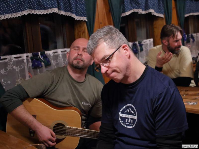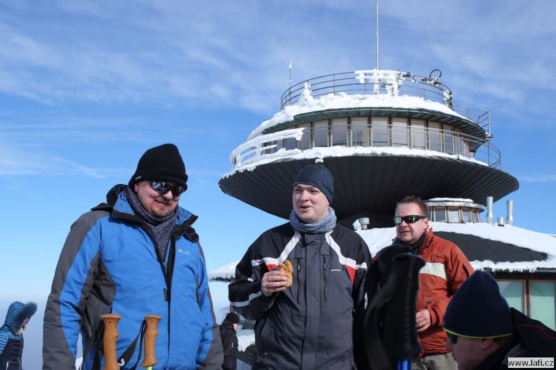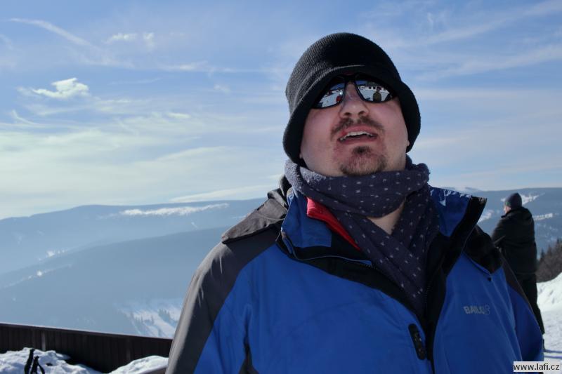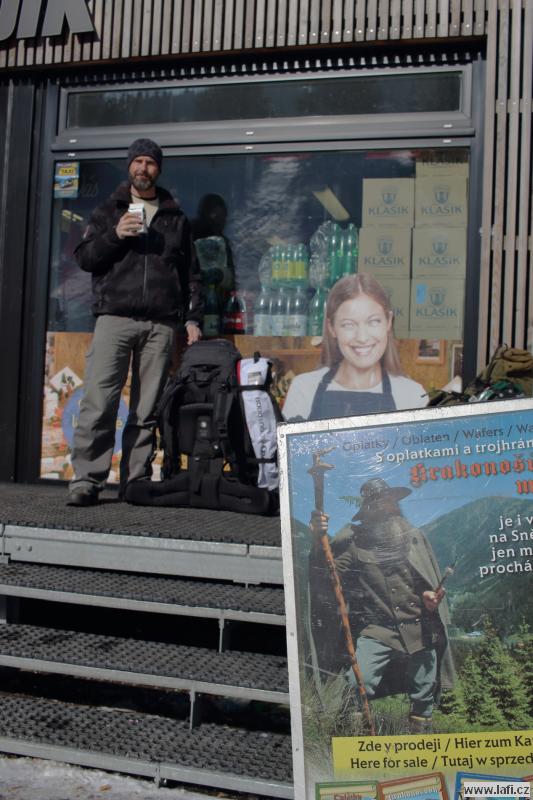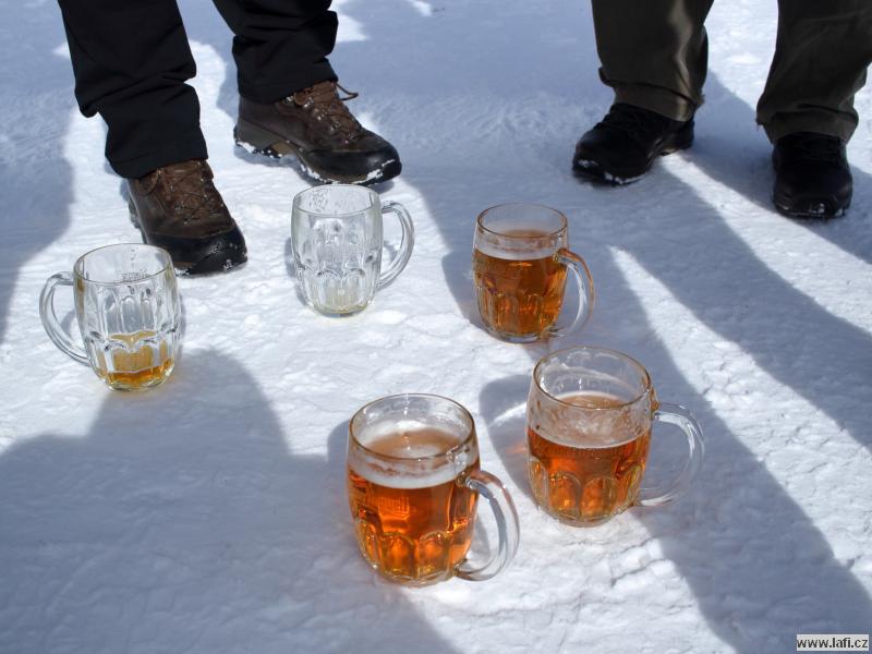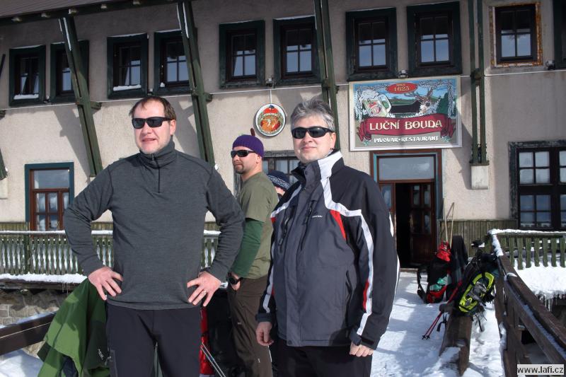 Čtvrteční odjezd nestíhám, jedu v pátek ráno. Už vím kam, do Pece pod Sněžkou. V autobuse se náhodou potkáváme s Vendou, jedoucím na stejnou akci. Výstup po sjezdovce prověřuje náš dech v mrazivém počasí. Kluky potkáváme před chatou, kde nocovali. Podle jejich výrazů přestávám litovat pozdního příjezdu. Večírek se jim, zdá se, vydařil. S plnou polní pokračujeme dál přes Liščí horu na Výrovku. Mráz mi při dýchání nedělá dobře, snad si zvyknu. Čekáme na opozdilce, co se zdrželi u kiosku Na rozcestí. Nedočkáváme se jich, už za tmy pokračujeme k dnešnímu cíli, Luční boudě. Máme tady přespat, ale po zjištění ceny ubytování, byť jen ve spacácích ve společné místnosti, máme sto chutí to obrátit a jít zpátky na Výrovku. Ani pivo nám tu nechutná. Po příchodu si vedoucí expedice vyslechne pár nelichotivých poznámek, ale nakonec zůstáváme. Celkem za střízliva si jdeme lehnout. Ráno snídaně v ceně, moc se nezdržujeme a vlečeme se na Sněžku. S velkým báglem na zádech to jde ztuha. Ale jsme nahoře, fičí tady a je pěkná kosa. Naštěstí svítí slunce, je krásně vidět do dálky. Moc se tu nezdržujeme, nazouváme konečně sněžnice a pod lanovkou sestupujeme do údolí. Říkám si, příště vezmu sebou místo sněžnic terénní běžky, takzvané Backcountry. Bude se mi pohybovat líp jak do kopce, tak z kopce. Zastavujeme v Růžohorkách a to se nám stává osudným. Tak se nám v Děčínské boudě líbí, že v přístřešku, který je součástí hospody, přespáváme. Kluci si dokonce na dobrou noc dávají venkovní horkou lázeň.