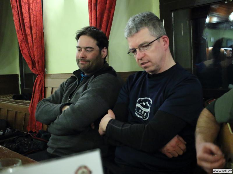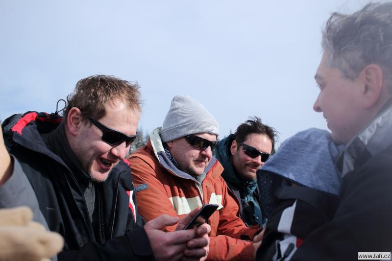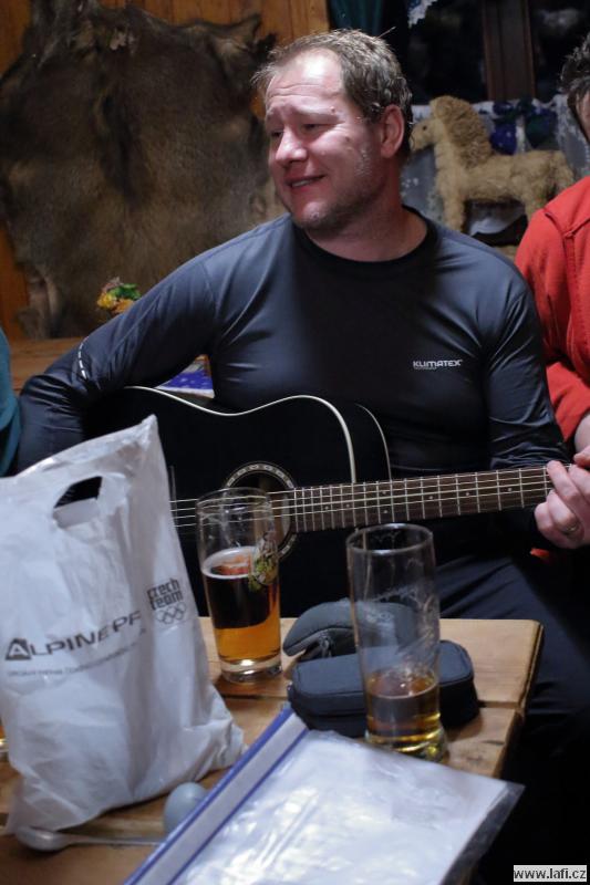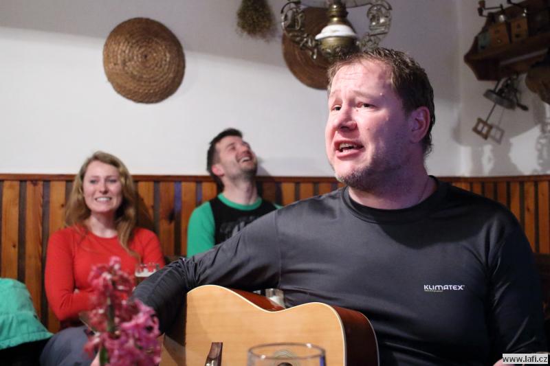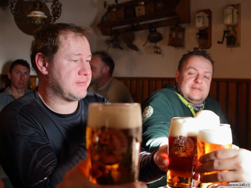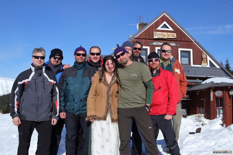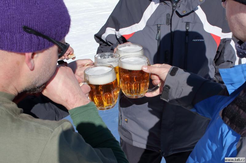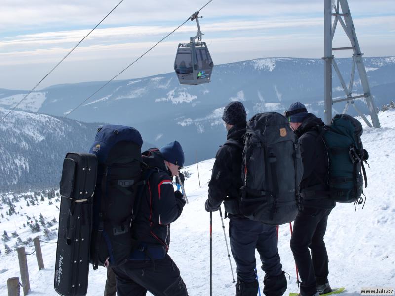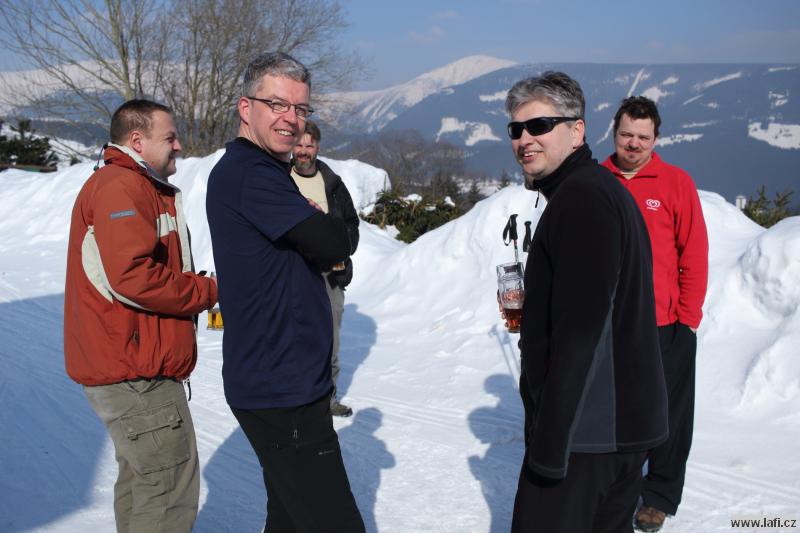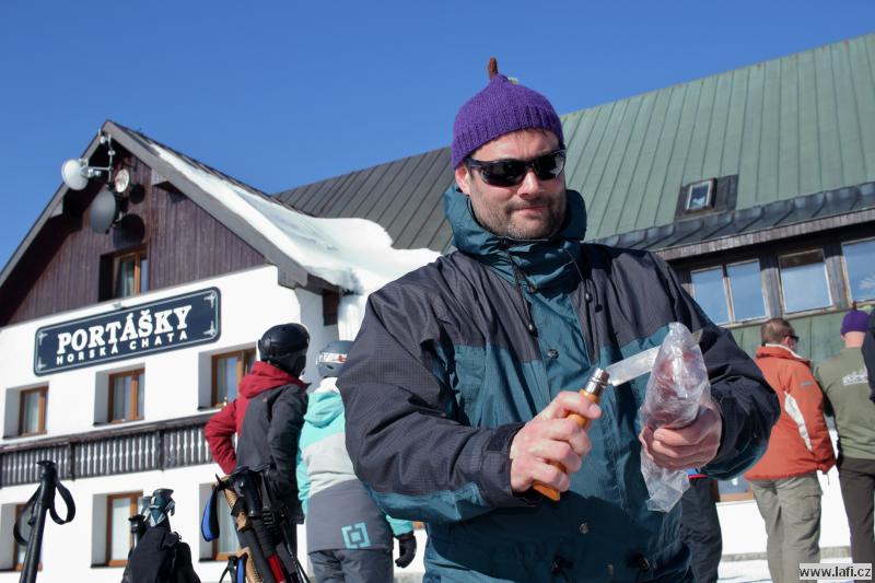 Ráno mi není moc do skoku, ale horský vzduch to spravuje. Před námi je už jen návštěva Portášových bud s divným číšníkem. Nechápu, jak kluci můžou v tý kose, co je venku, lemtat pivo. Po občerstvení nás čeká už jen sestup po sjezdovce do Úpy na autobus.