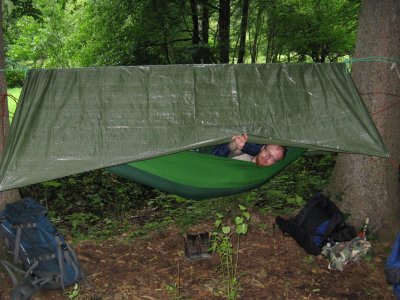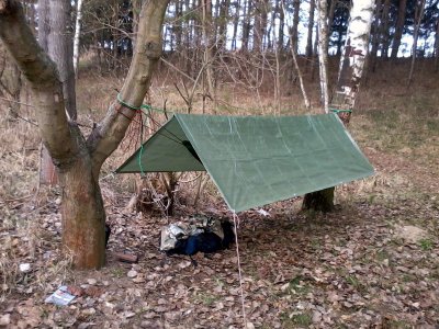 Aby na mě nepršelo a ze stromů nepadalo všechno možné, stavím nad hamakou ještě stříšku z plachty. Mohl bych si koupit celtu přímo pro hamaku, ale je dost drahá a plachta z maketu za pár korun udělá stejnou službu a nemusím se o ní tak bát. V oblibě mám rozměr 2 x 3 metry. Je to tak akorát, s pomocí jednoho lana a pár šňůrek vytvořím takové levitující "áčko" mezi stromy :-)